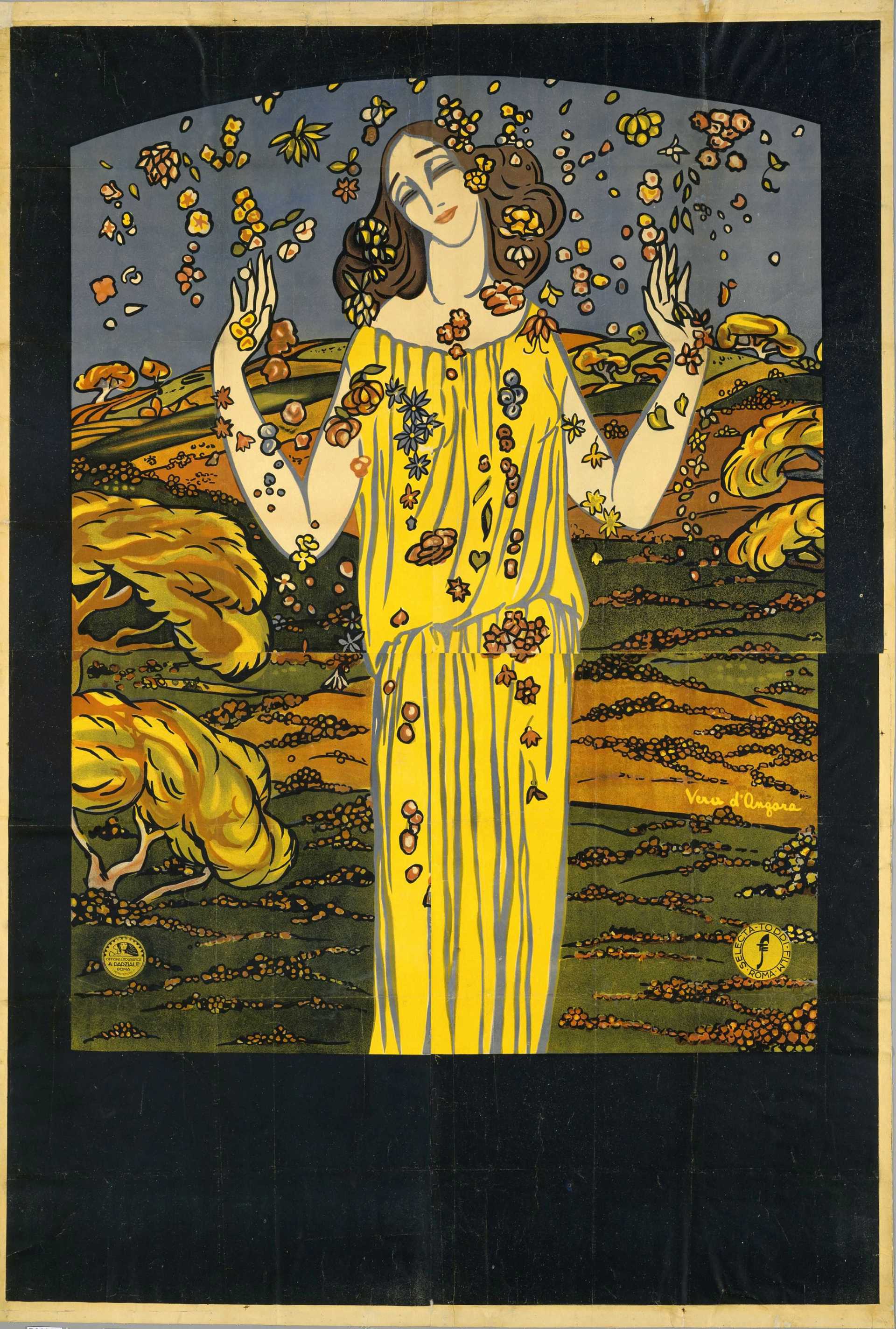 Il percorso espositivo, curato da Nicoletta Pacini e Tamara Sillo, presenta 10 manifesti di grande formato dal muto al sonoro, più la brochure realizzata da Renato Guttuso per il lancio del film Riso Amaro di Giuseppe De Santis. «Per diversi decenni, se si escludono i grandi divi, i manifesti furono l’unico modo per attrarre il pubblico al cinema – sottolinea Enzo Ghigo, presidente del Museo Nazionale del Cinema – e il rivoluzionario fermento culturale dei primi anni del Novecento ha favorito questa commistione tra le arti. Era un nuovo modo di raccontare e raccontarsi, di entrare in contatto e di comunicare, di trovare nella trasversalità dell’esperienza artistica una nuova voce. Il nostro museo ha un considerevole numero di manifesti, quasi 540.000, molti rari e preziosi. Con questa mostra vogliamo dare, ancora una volta, risalto alla ricchezza delle nostre collezioni e all’unicità dei nostri materiali». È dunque la centralità dei manifesti nel sistema cinematografico a favorire il dialogo naturale tra arti visive e immaginario cinematografico, che la mostra presenta come parte integrante del cinema e della sua evoluzione. Ad aprire la mostra è un episodio singolare: Vera D’Angara, attrice, pittrice e illustratrice, che nel manifesto di Al confine della morte rappresenta se stessa con un tratto ancora vicino alla morbidezza Liberty ma già orientato verso la semplificazione déco. La sua biografia attraversa diversi mondi: l’infanzia in Siberia, sulle rive del fiume Angara da cui ricava il nome d’arte; la formazione parigina all’Académie des Beaux-Arts; la partecipazione ai circoli artistici russi; l’esperienza teatrale con la compagnia Pitoëff, fino all’arrivo in Italia, dove incontra Toddi e inizia a lavorare nel cinema come attrice e, talvolta, soggettista. Al confine della morte, uno dei film prodotti dalla coppia Selecta-Toddi, appartiene alla stagione delle pellicole mute in cui D’Angara interpreta ruoli melodrammatici costruiti intorno alla sua immagine di donna elegante e malinconica. Il manifesto non restituisce un episodio del film: ne ricrea il clima emotivo attraverso una figura sospesa, accarezzata da una pioggia di fiori e immersa in un paesaggio mosso dal vento, con il bordo superiore arrotondato a enfatizzarne l’armonia. L’assenza del titolo — prassi comune nel muto — accentua il carattere autonomo dell’immagine e rivela un’intenzione precisa: non illustrare, ma tradurre in forma la sensibilità dell’artista. In questo gesto emerge una consapevolezza rara: il film diventa un pretesto, il manifesto un luogo in cui D’Angara può concentrare tutto ciò che sullo schermo rimarrebbe implicito. La carta accoglie una versione più interna del personaggio, una sorta di autorappresentazione che non segue la narrazione ma la sua risonanza visiva.