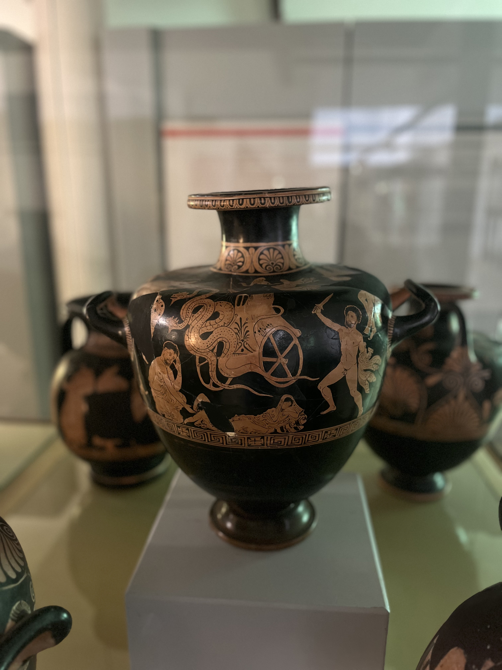 Vaso (Hydria) a figure rosse con scena di Medea (infanticida) su carro alato proveniente dalla necropoli orientale, tomba 1 (cosiddetta «Tomba del Pittore di Policoro»), V secolo a.C.