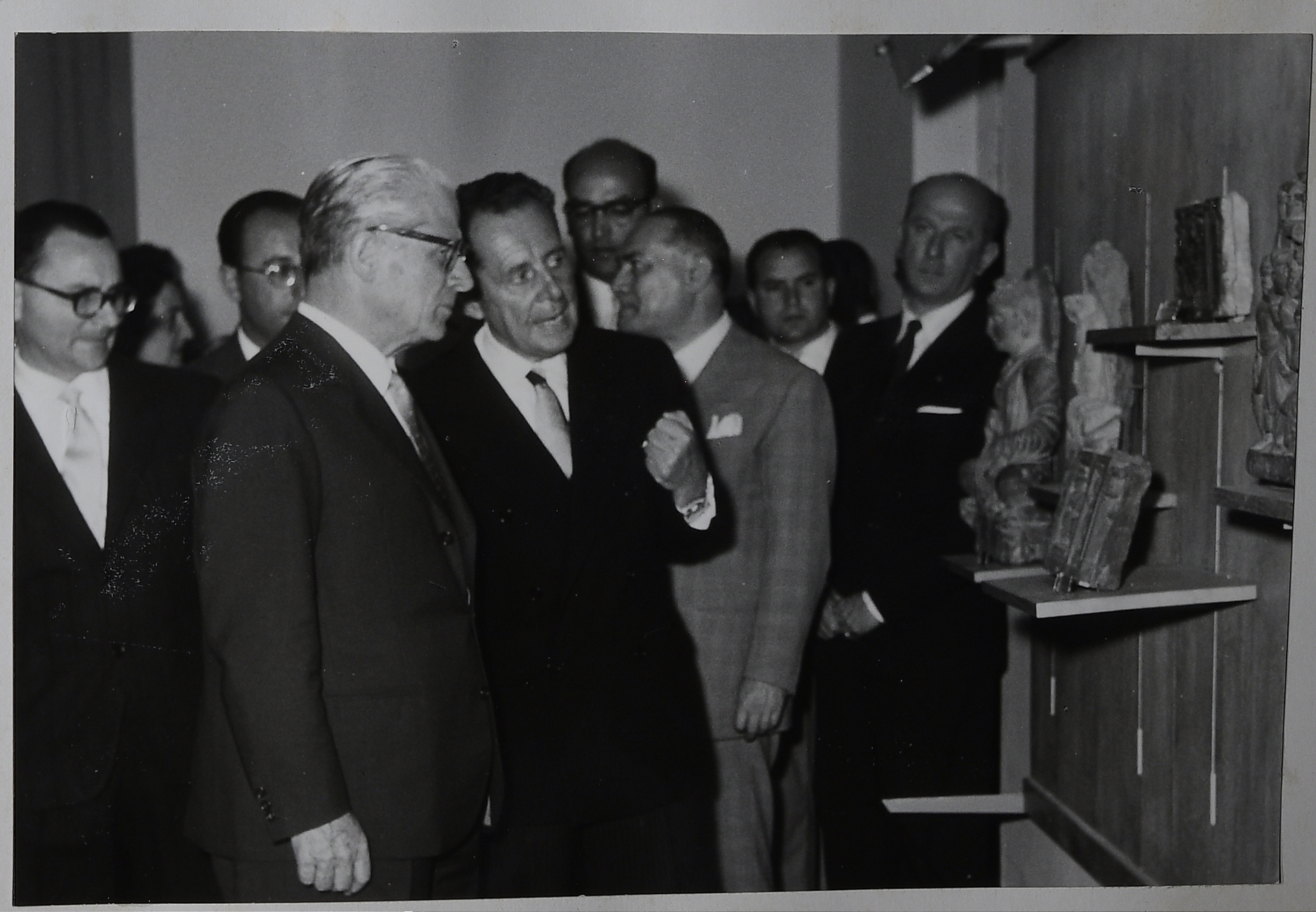 Giuseppe Tucci mostra al Presidente della Repubblica Giovanni Gronchi alcune opere della mostra d’arte del Gandhara il giorno dell’inaugurazione del Museo Nazionale d’Arte Orientale (1958). Album Giannetto Silvestrini 1. Biblioteca IsIAO, Biblioteca Nazionale Centrale Vittorio Emanuele II di Roma
