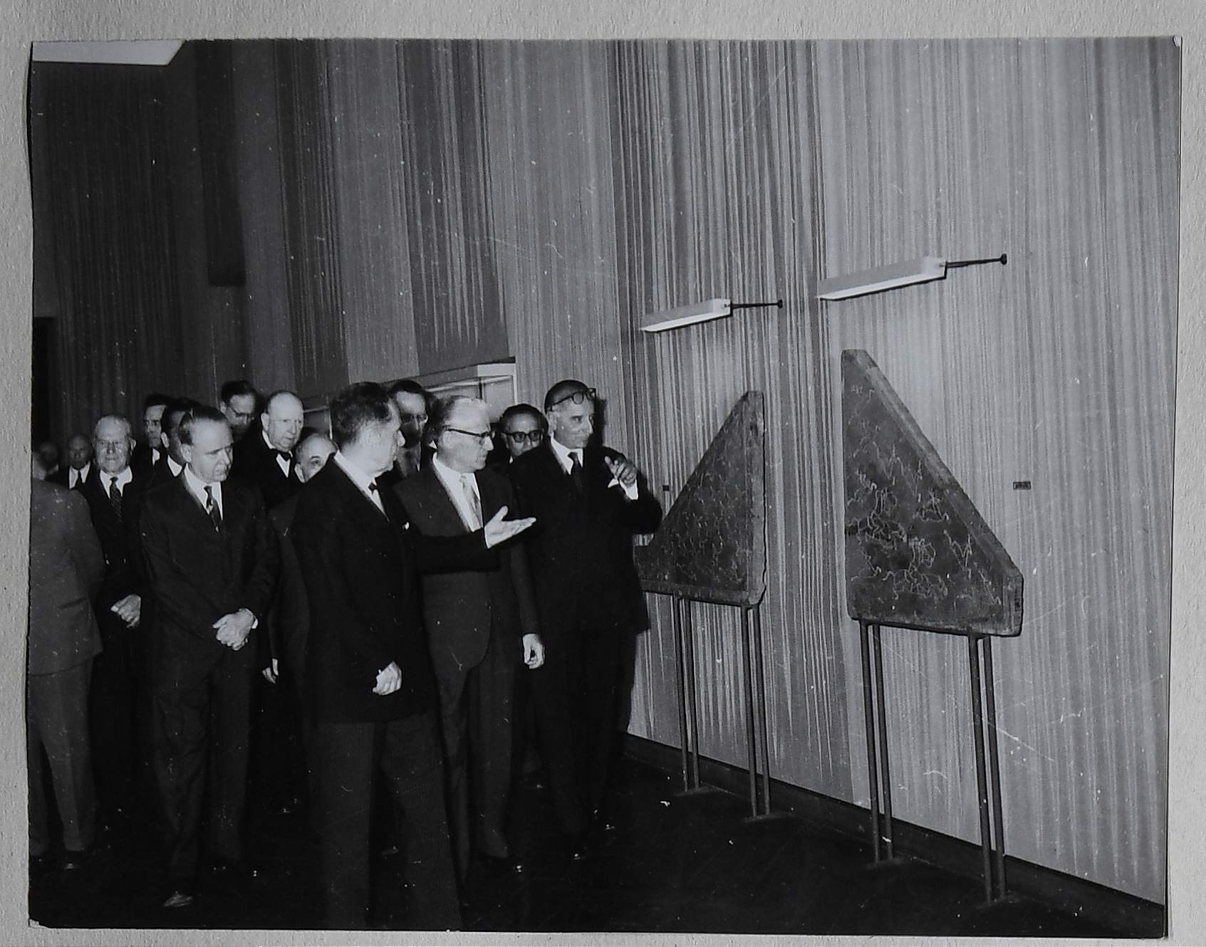 Giuseppe Tucci e Alberto Giuganino mostrano due mattoni provenienti da una tomba della dinastia Han al Presidente della Repubblica Giovanni Gronchi in occasione dell'inaugurazione del Museo Nazionale d’Arte Orientale (1958). Album Giannetto Silvestrini 1, Biblioteca IsIAO, Biblioteca Nazionale Centrale Vittorio Emanuele II di Roma