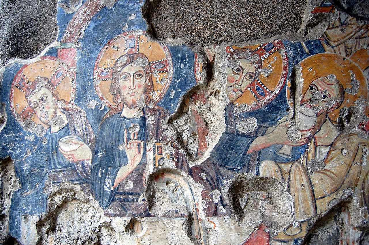 Affresco del Cristo con l’Eucaristia nel Complesso Basilicale di Cimitile. Foto tratta da Wikipedia. Foto: don Tommaso | CC BY SA 2.0