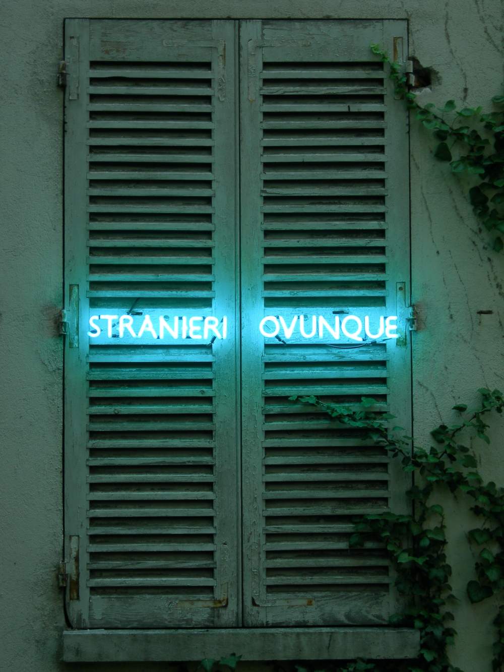 In realtà, come abbiamo spesso raccontato, l’idea di «Stranieri Ovunque» viene da una firma su un volantino antirazzista trovato a Torino ormai vent’anni or sono. Quindi, fin dal principio, si tratta di un’appropriazione che, essendo anche un nostro autoritratto, è diventata parte integrante delle nostre vite: il neon «Stranieri Ovunque» che esponemmo nel 2004 è la prima cosa che si vede entrando a casa nostra, «foreigners everywhere» è la nostra email ed è il titolo del nostro primo catalogo edito da Koenig. No, non avevamo idea che Adriano avesse scelto questo titolo per la Biennale ed è stata una vera sorpresa che però è da subito apparsa carica di senso. Da un lato, ci ha reso doppiamente omaggio appropriandosi di queste parole, come noi l’avevamo fatto in principio, e citandoci come la fonte della sua ispirazione, ma dall’altro ha anche sconvolto i parametri in gioco trasformando una frase che sentivamo ormai come nostra in un ready-made, perché così decontestualizzata diventa qualcosa che si relaziona con altre circostanze, altre opere, con un altro contesto che non conosciamo né controlliamo (la mostra non è ancora aperta e non sappiamo come sarà). In questo momento sembra un titolo perfetto per definire la crisi che attraversiamo e in particolare il conflitto israelo-palestinese, emblematico rispetto alla questione coloniale, la diaspora e il sentimento nazionalista, cui abbiamo dedicato tanti lavori e una versione specifica di «Foreigners Everywhere».