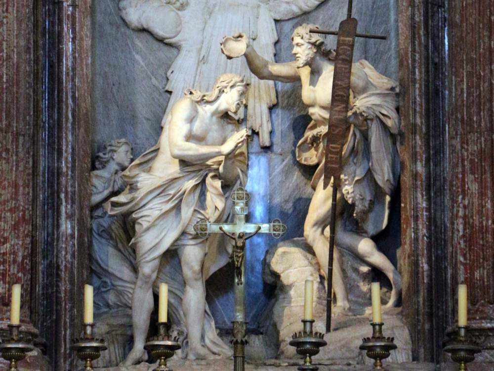 Esso è un vero scrigno di tesori del Barocco Romano, soprattutto in ambito scultoreo: cito su tutti il «Battesimo di Cristo» di Antonio Raggi, che funge da pala dell’estroso altare in marmo rosso progettato da Francesco Borromini, dove il Dio padre con gli angeli irrompe all’improvviso e pare planare enfaticamente sulla scena principale, con le figure sottili ed eleganti del Battista e di Gesù avvolti da ricchi panni che metamorficamente paiono prendere vita propria, a rendere ancor più coinvolgente il momento raffigurato.