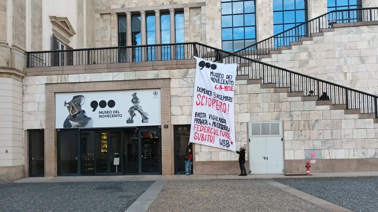 Uno striscione appeso al Museo del Novecento di Milano durante una protesta nel dicembre 2023