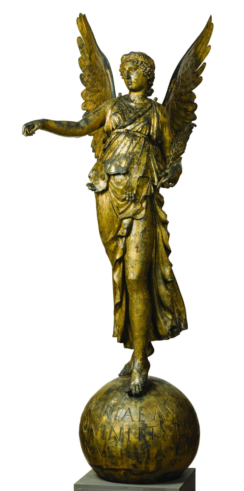 La scultura raffigura una Vittoria Alata che si leva in volo sul globo terracqueo e, grazie all’iscrizione dedicatoria agli imperatori Marco Aurelio e Lucio Vero, è databile fra il 161 e il 169 d.C. Fu rinvenuta nel 1836 in provincia di Cremona a Calvatone, nome moderno di «Bedriacum», vicus romano sulla via Postumia.