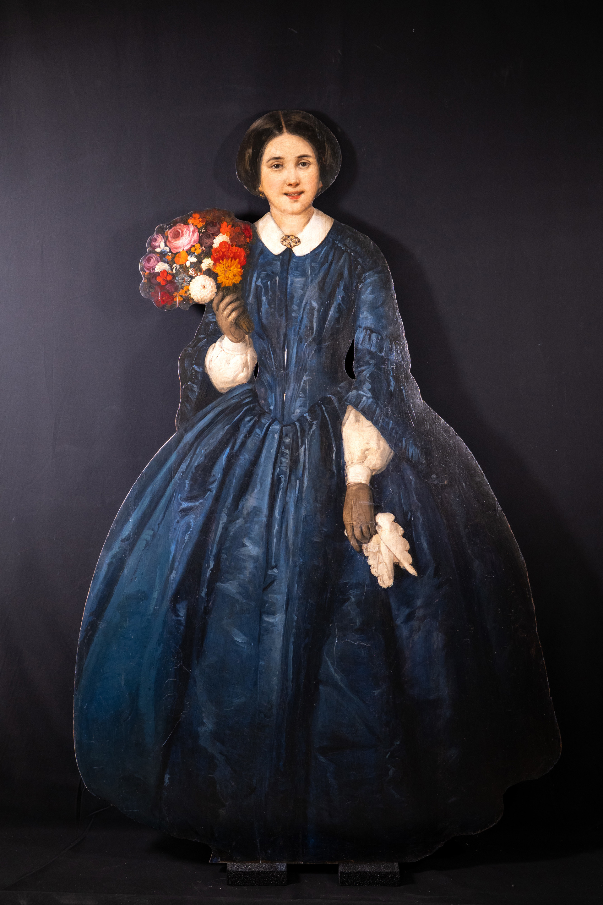 Lavori di questa natura sono rarissimi, perché andati perduti per l’uso e per la scarsa qualità del supporto: di Inganni se ne conoscono altri due, in collezione Litta, raffiguranti un «Ussaro» e una «Brianzola», ma questo è il più accattivante per il soggetto, Amanzia Guerillot la giovane donna nata in un’ottima famiglia francese residente a Milano (era figlia del Primo contabile di Napoleone Bonaparte), che fu allieva di Inganni, sua modella e sua amante, poi seconda moglie dopo la morte della prima. Qui indossa un abito di lucente seta blu con un colletto bianco chiuso da una spilla realizzata a rilievo, in pastiglia poi dorata, e fra le mani, guantate, stringe il mazzo di fiori coloratissimi e un fazzolettino ricamato.