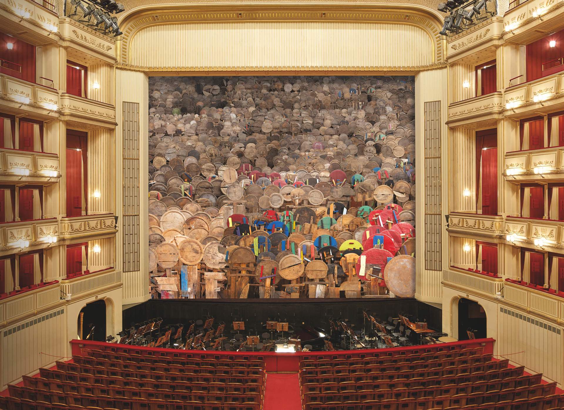 Quell’immagine della grande folla lignea di semplici persone dalla testa rotonda, fissata con speciali magneti alla struttura del sipario, pare interrogare il pubblico seduto in platea. Che cosa vuole trasmettere a chi vedrà il suo sipario prima di ogni rappresentazione?