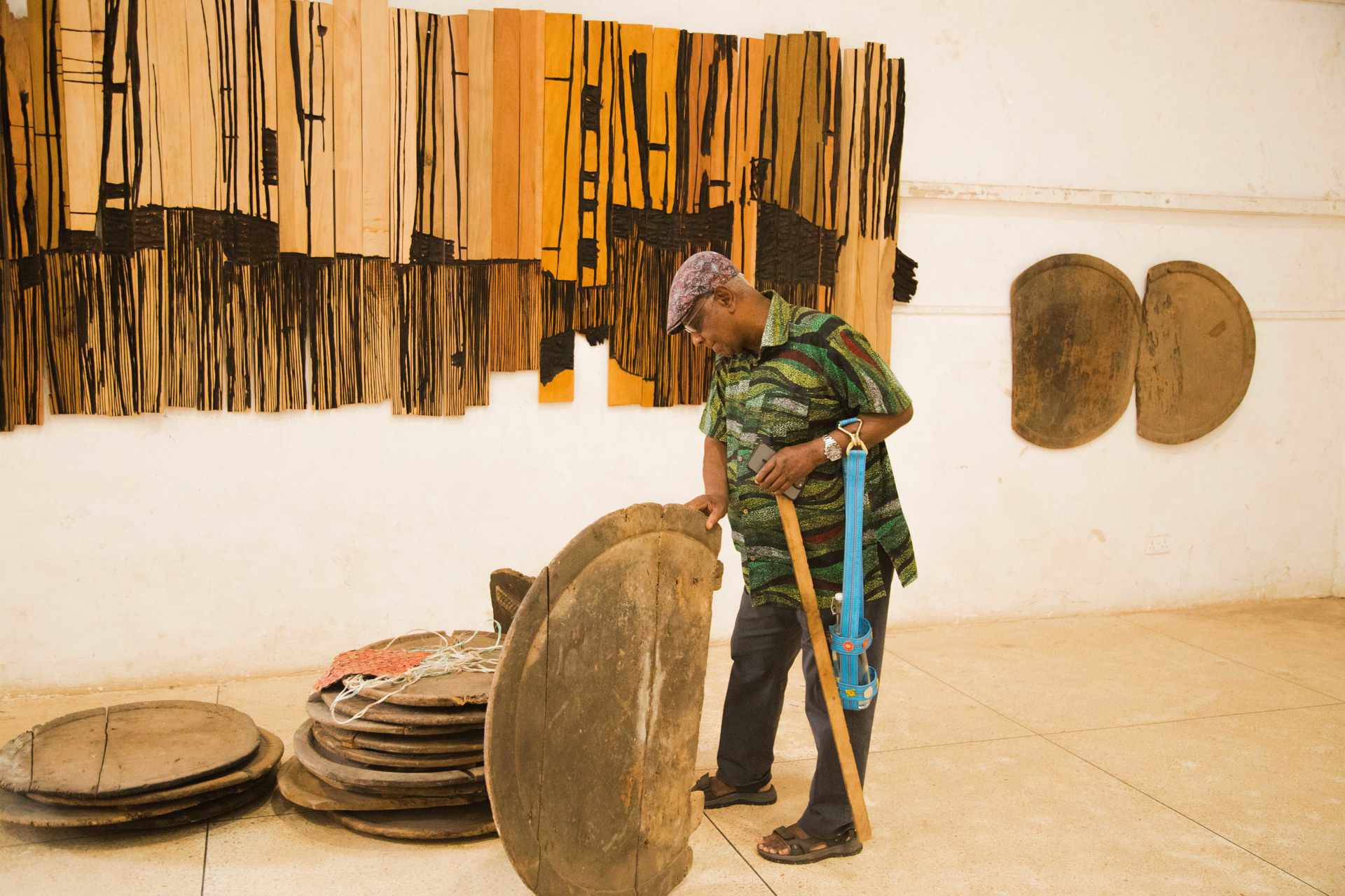M’imbattei per caso nei vassoi di legno che le donne usavano nei mercati per presentare le loro merci (pesce, pomodori, peperoni). E mi misi a riflettere su che cosa fare di quei vassoi, visto che avevano già una loro fisionomia. Avevo cominciato a studiare le forme d’arte ghanesi, come i simboli grafici Adinkra, che non conoscevo ancora: da noi si studiava continuamente la storia europea ma non la storia africana, per cui per me fu una scoperta stimolante. Lavorai con i simboli Adinkra per cinque anni, cercando di comprendere com’erano costruiti e che significato avevano, e tentando di capire se avrei potuto crearne di miei. Ideai così un modo semplice di disporre quei simboli sui vassoi di legno, scaldando delle barre di ferro e marchiandoli sui vassoi. Quindi l’idea che l’arte dovesse essere qualcosa che scaturiva dal mio ambiente mi venne piuttosto presto, proprio per via di quel piano di studi britannico che ci aveva estraniati dalla nostra cultura. Più tardi la sfida diventò invece quella di inserire i miei lavori in un contesto internazionale. E in questo senso cominciai con una residency negli Stati Uniti e una mostra di sculture in legno nel 1980.