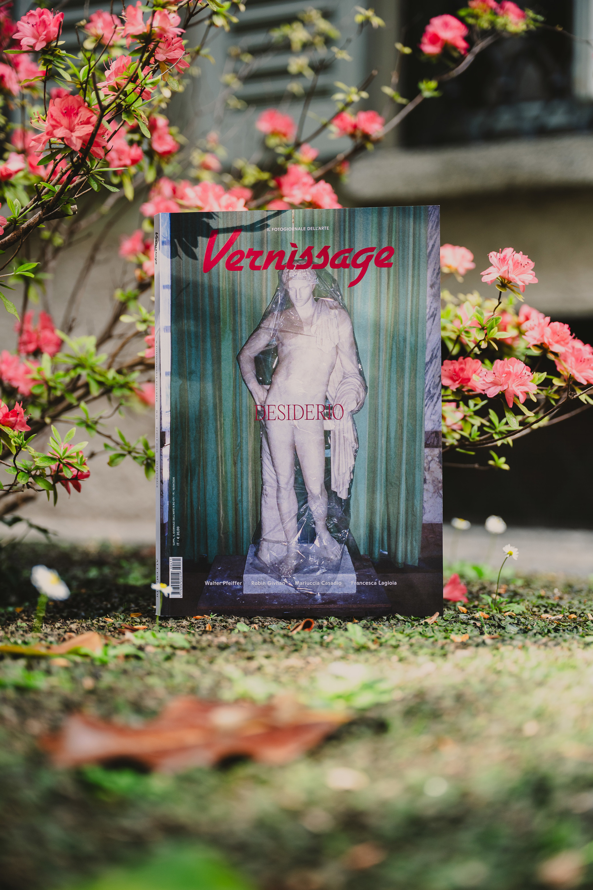 La fotografia di copertina firmata da Walter Pfeiffer contiene in sé questa intima e fertile ambiguità. Una scultura classica è interamente avvolta da un manto trasparente che aderisce alla superficie del marmo quasi come una seconda pelle come un abito in-the-making. Il gesto è semplice e al tempo stesso perturbante: calzare un liquido stropicciato tra le venature minerali, velandole e soffocandole. Il corpo antico viene così protetto, accarezzato, nascosto, erotizzato da questa pellicola sottile, lirica, tattile, inquadrata in una quinta smeraldo: un panneggio teatrale che evoca il raso, la seta di un letto che si riverbera morbida e rigida sulla spalla romana. Un timido cascare lascivo che fa della sua decadenza la sua potenza. La spavalderia dell’apollo sta nell’incedere d’anca, la sua fragilità tracima nella piattaforma di compensato su cui è posto — abbandonata, emotivamente precaria, come un desiderio corrisposto troppo in fretta. Preziosamente sporca come la sua base, l’immagine si muove in un purgatorio di intenti, in bilico tra memoria, grazia, forza, costrizione, sensualità. Qui si accende la tessitura limpida di Vernissage: la moda come costruzione dell’immagine del corpo, il lusso come spazio di elaborazione simbolica, l’arte come dispositivo critico capace di interrogare il desiderio che attraversa queste dimensioni.
