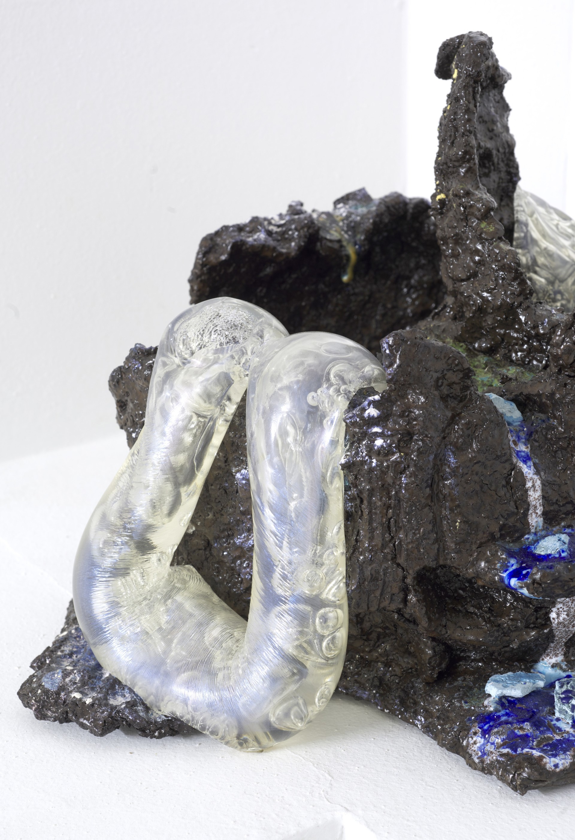 Accanto a queste opere si trovano le sculture della serie Diatomee (2025) forme organiche che sembrano provenire da un’epoca geologica remota. Le diatomee, microalghe unicellulari comparse circa 145 milioni di anni fa e responsabili di un quarto dell’ossigeno terrestre, diventano per l’artista un modello di forma vitale primaria. Ancora in tensione, come se il processo di cottura non si fosse mai davvero concluso, sono anche le opere della serie Memoria primordiale (2025). Qui la ceramica si intreccia a forme organiche in acetato, simili a tubi o cuscini di silicone, che emergono, strabordano e si insinuano nelle superfici solide e stabili della terra cotta, come se il materiale cercasse ancora di espandersi oltre i propri limiti.