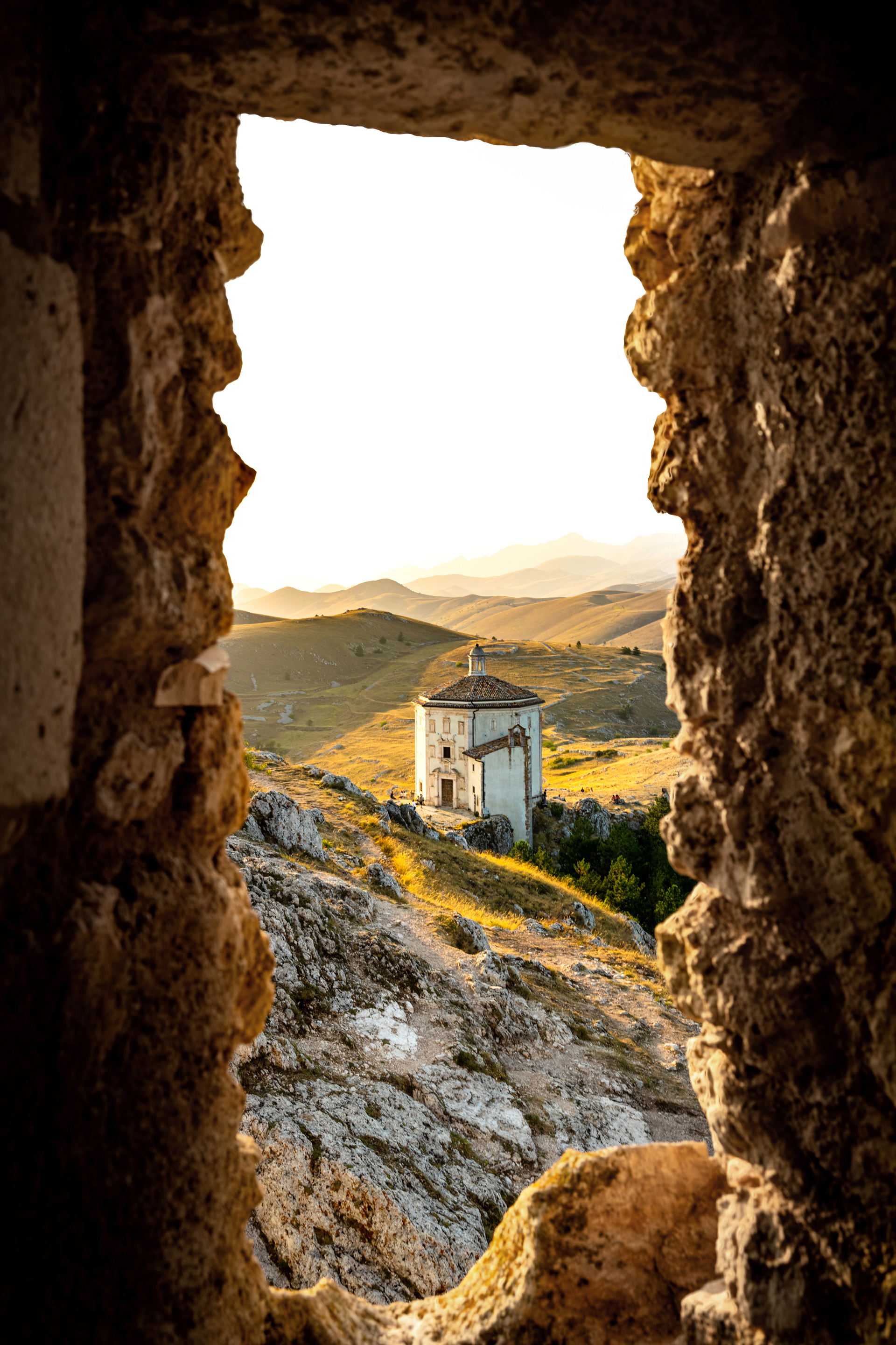 Da una feritoia del Castello di Rocca Calascio (Aq) è possibile ammirare la Chiesa di Santa Maria della Pietà