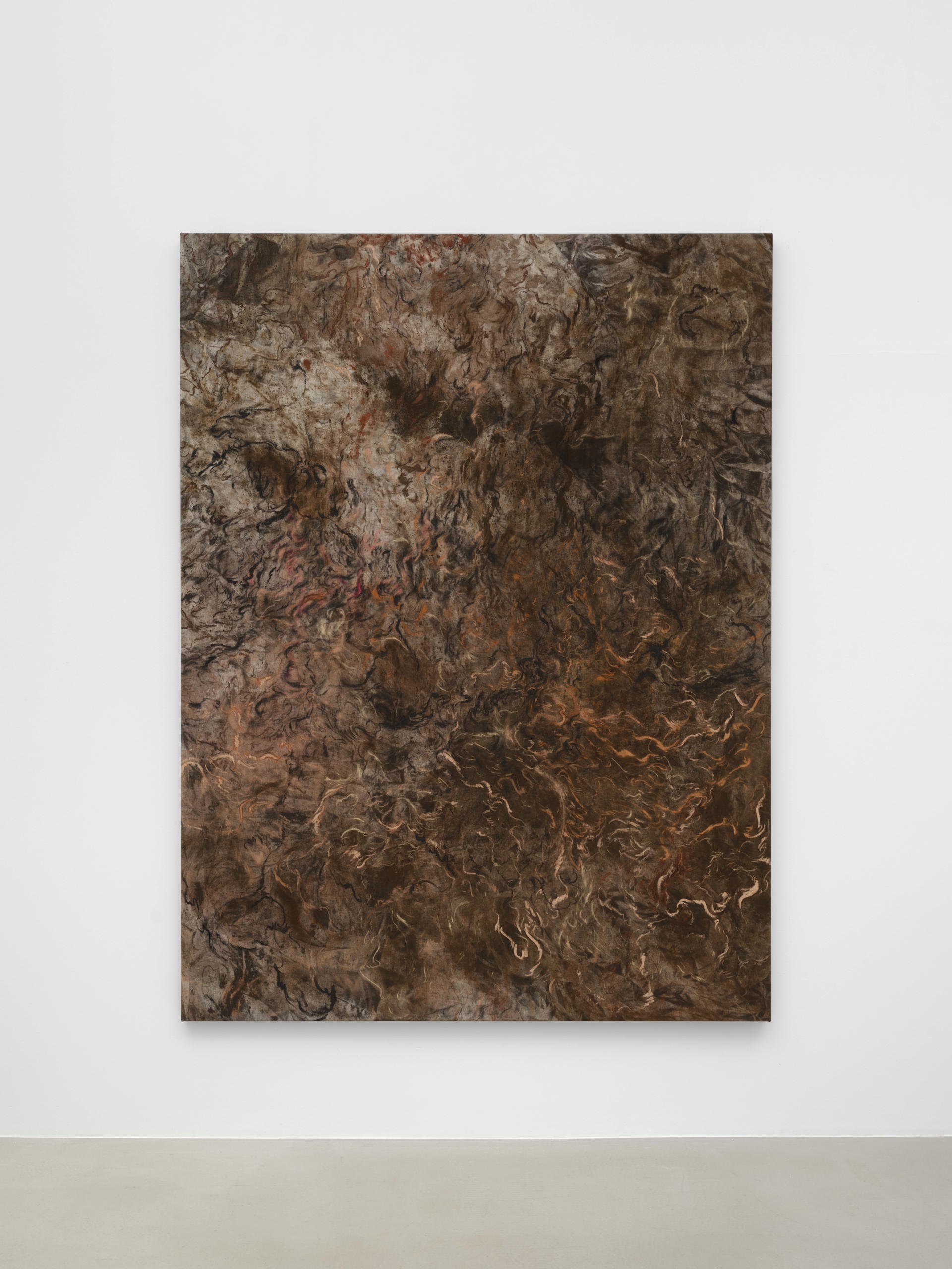 Monia Ben Hamouda, Blindness, Blossom and Desertification XXIV, 2025. Tecnica mista su lino (ibisco, carbone, argilla rossa, argilla nera, terra, olio e pastelli a cera), 200 × 150 × 4 cm. Courtesy dell’artista e ChertLüdde