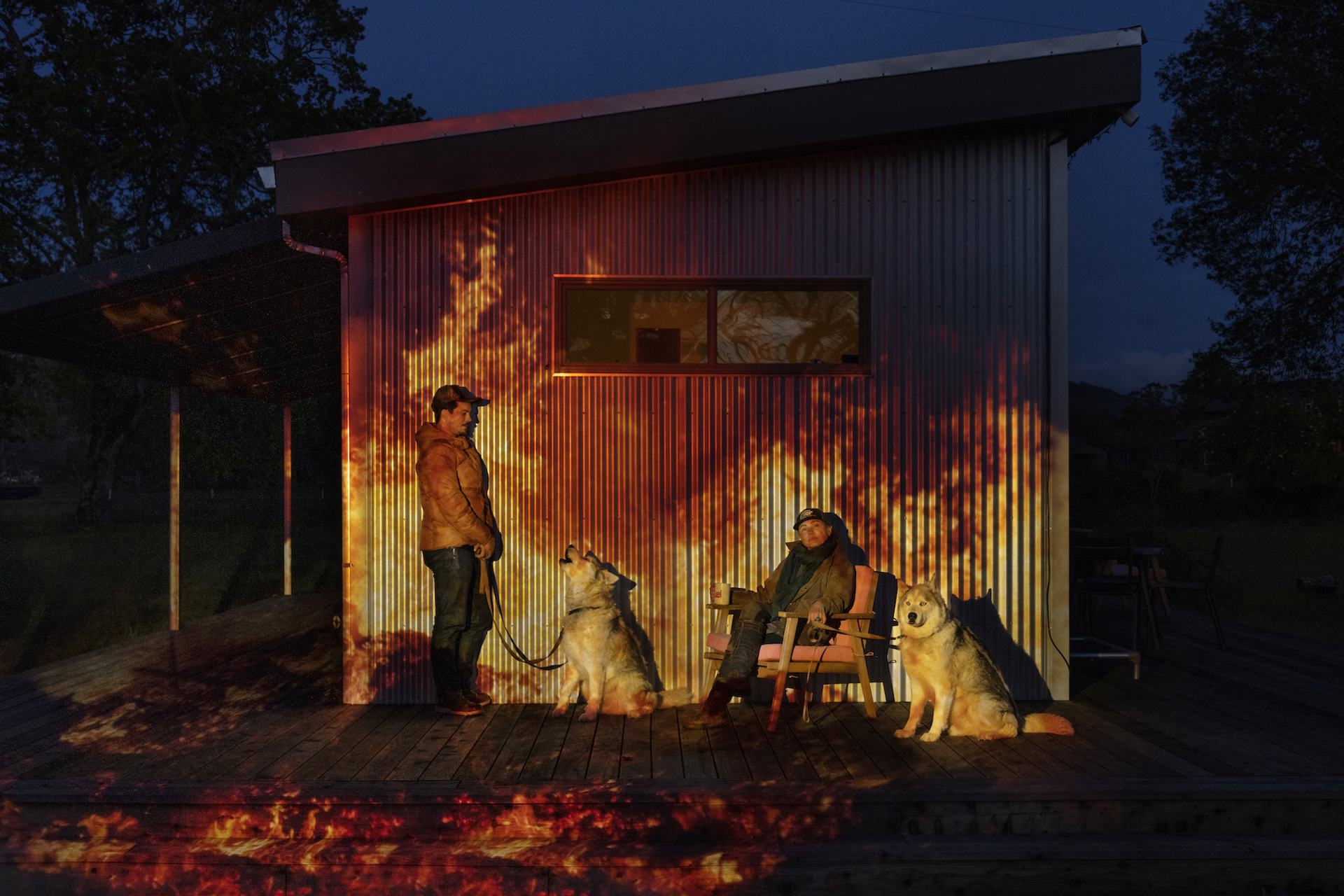 Altra cosa, si diceva, è però vederle: e anche qui avviene una sovrapposizione di tempi e dimensioni. Le persone incontrate dai fotografi, ritratte nelle proprie case e nei propri ambienti, colpite dal flash che porta con sé la proiezione futura delle condizioni ambientali cui quei luoghi vanno incontro, non si accorgono dell’incantesimo. Siamo noi i testimoni esterni dello stravolgimento, noi ad avere il giusto tempo per assimilarne la portata. Si tratta di un attimo, e un ritratto di gruppo, una qualsiasi scena quotidiana, possono essere travolti dalle fiamme, dalle acque alluvionali, da prati fioriti laddove ora esiste la neve. Adesso due ragazzi siedono su un motorino alle spalle di una casa, ma già vediamo le acque dell’oceano e la sua fauna prendere il proprio spazio, sovrastare tutto, ragazzi e casa.