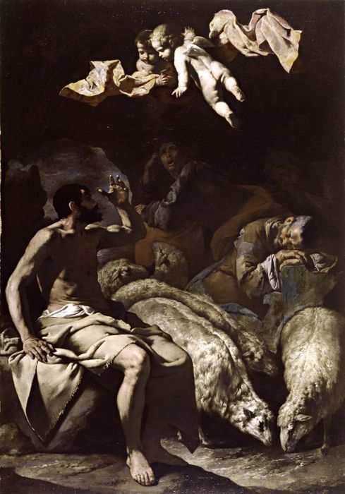Qui non ne facciamo, per una volta tanto, una questione di attribuzione o di filologia; guardiamolo, invece, questo quadro per quello che è, e guardiamolo bene. Caravaggesco della prima ora, raffigura un gruppo di pastori che ricevono l’annuncio dagli angeli secondo il racconto evangelico di Luca (2.1-7): «C’erano in quella regione alcuni pastori che, pernottando all’aperto, vegliavano tutta la notte facendo la guardia al loro gregge. Un angelo del Signore si presentò a loro e la gloria del Signore li avvolse di luce. Essi furono presi da grande timore, ma l’angelo disse loro: Non temete: ecco, vi annuncio una grande gioia, che sarà di tutto il popolo: oggi, nella città di Davide, è nato per voi un Salvatore, che è Cristo Signore». Eccoli i pastori, stavano tranquilli, a dormire e a scaldarsi fra le loro bestie e, all’improvviso, dall’alto gli si materializzano davanti due angioletti grassi, che si fa fatica a pensare possano volare dal momento che sembrano due rolatine. Fra i panni svolazzanti parlano a questi quattro pecorai e dicono loro cose inaudite, cose che tutti i re e i patriarchi e i profeti della Bibbia avrebbero voluto sentirsi dire e per le quali hanno spasimato e atteso nei millenni, e che invece vengono annunciate a questi straccioni. Nel caos e nella povertà delle loro vite i pastori vedono apparire, secondo la promessa biblica di Isaia (9,1), la luce, la vera luce. «Un popolo che camminava nelle tenebre vide una grande luce; su coloro che abitavano in terra tenebrosa una luce rifulse».
