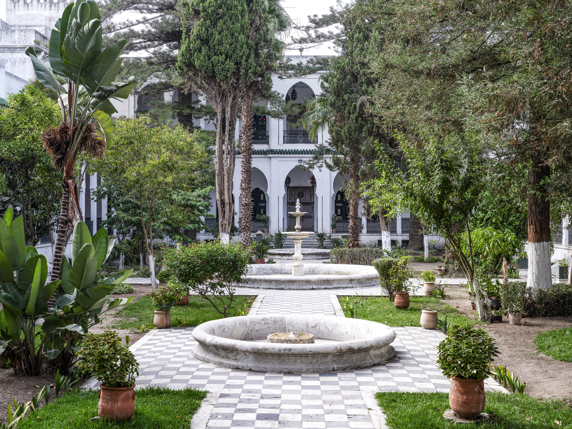 Per chi non lo sapesse, occorre ricordare che allora come oggi «spagnoli, inglesi, francesi, italiani, mori, ebrei, tutti vivono a Tangeri come in un’arca cosmopolita», e allora come oggi, come scriveva ancora Alexandre Dumas, «a Tangeri si parlano tutte le lingue d’Europa: spagnolo, francese, inglese, italiano; e tutte le lingue d’Oriente: arabo, berbero, turco». E il palazzo che il sultano alawita Mūlāy Abd al-Hafiz volle per sé è anch’esso poliglotta perché parla tutte le lingue. Parla quella policroma e moresca dei mosaici, detti «zellige» (dall’arabo zullaj), che ininterrottamente, dal Bosforo fino alla costa dell’Atlantico, decorano le pareti d’ogni moschea, madrasa e palazzo d’un certo rango. Parla anche, altrettanto bene, quella toscana dei camini, «ricamati» con aquile dal collo di cigno in marmo grigio che appartengono a quel gusto eclettico Liberty e Déco che dalle capitali del Continente giunse a contaminare gli interni delle case della media e alta borghesia dal Cairo a Baghdad e anche oltre.