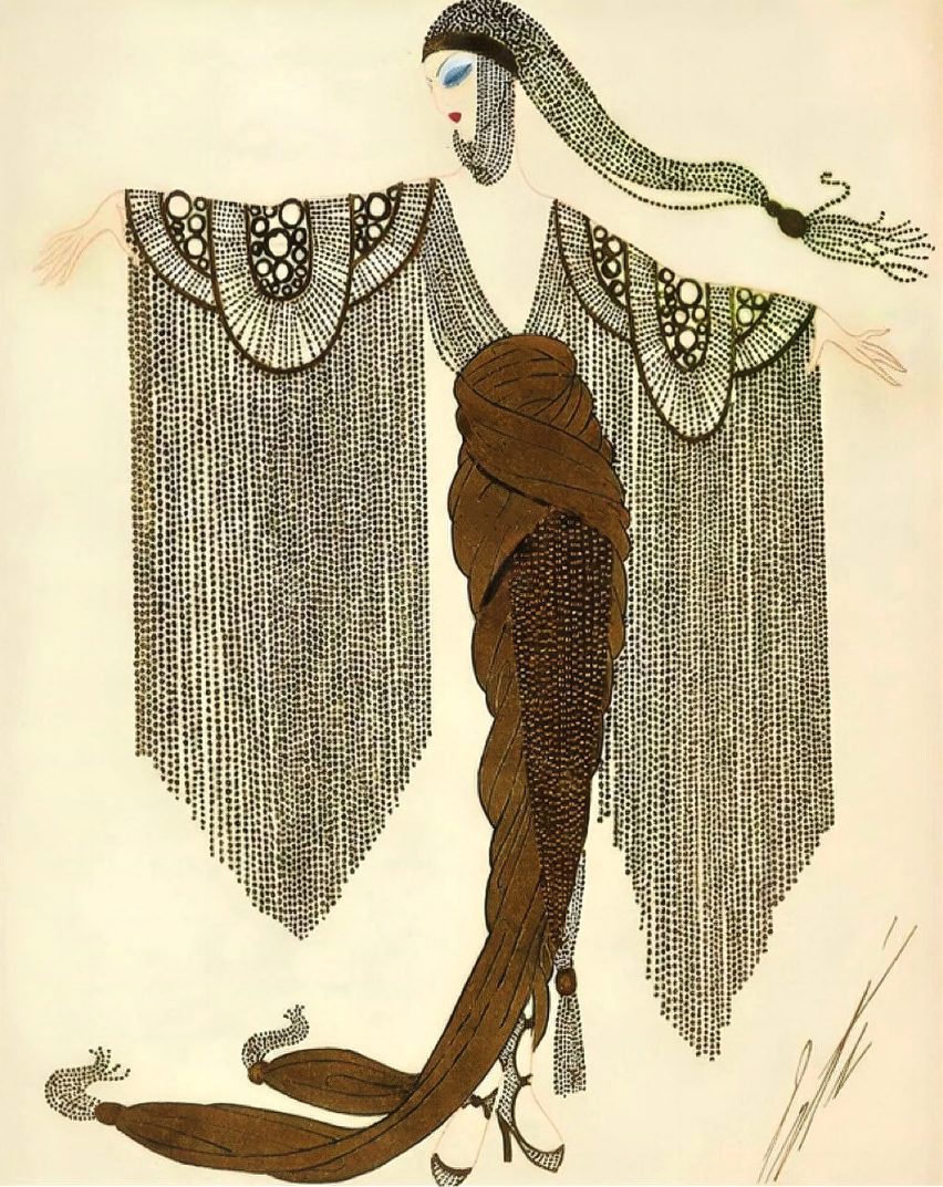 Il linguaggio di Erté si nutre di una cultura visiva complessa e articolata. Le figure femminili evocano la «femme fatale» simbolista e le linee sinuose e ornamentali dell’Art Nouveau, richiamando le arabescature dei corrimano e delle scale o dei metropolitani di Hector Guimard. La bidimensionalità decorativa e il lusso dei dettagli rimandano alle figure di Gustav Klimt, come nel «Frieze of Beethoven», e ai poster di Henri de Toulouse-Lautrec, dove il corpo femminile diventa protagonista narrativa e scenografica. Ogni riferimento storico o artistico, tuttavia, viene rielaborato attraverso una geometria rigorosa e proporzionata tipica dell’Art Déco: la linea governa la composizione, struttura la figura e disciplina l’ornamento, conciliando teatralità, decorazione e funzionalità visiva. L’uso del colore e della superficie si collega a sensibilità impressioniste, mentre il ritmo delle composizioni risente della formazione scenografica e teatrale, in cui costume e spazio dialogano in maniera simile a un progetto architettonico.