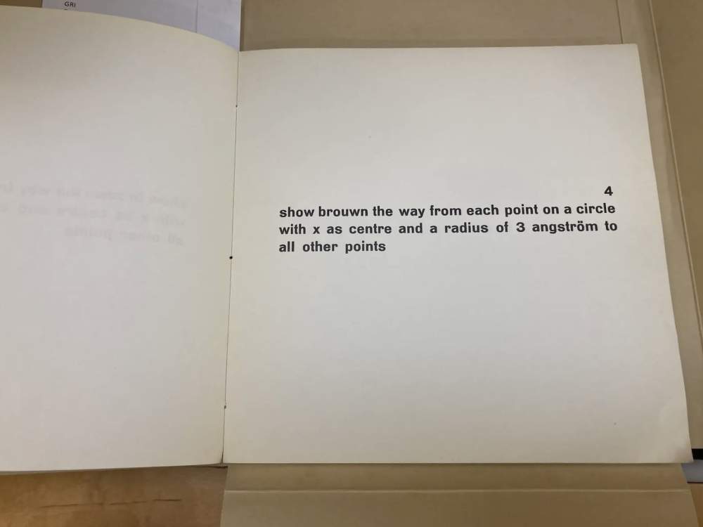 Per quanto riguarda i libri di Brouwn, la maggior parte consiste in numeri o misure dattiloscritte, disposte una per pagina o in fitte colonne e file. Sono chiaramente libri d’artista, anche se pubblicati per accompagnare le mostre, e sfidano una facile interpretazione. Un libro del 1981 intitolato «one distance» è composto da linee verticali, 10 per pagina, che misurano 10 cm ciascuna. Un libro del 1971 intitolato «1 step-100000 steps» consiste in file di numeri da 1 a 100.000, che riempiono oltre 100 pagine. Il mio libro preferito, «100 this-way-brouwn-problems for computer I.B.M. 360 model 95», contiene in ogni pagina un comando digitato per «mostrare a Brouwn il percorso da ogni punto di un cerchio» a tutti gli altri punti con un determinato raggio espresso in angstrom (un centomilionesimo di centimetro).