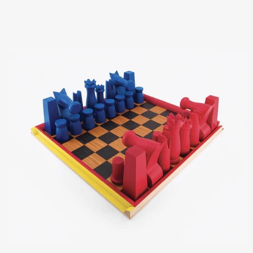 Ogni scacchiera attualmente in vendita è stato ricostruita a partire da scansioni 3D dell’originale e successivamente fresata con precisione da blocchi di legno massello dipinto, preservandone texture, proporzioni e imperfezioni espressive. Il risultato è un insieme di 32 componenti che mantengono intatto lo spirito artigianale dell’opera originaria, accompagnati da scacchiera, vassoio giallo, sacchetti protettivi in tessuto e una raffinata presentation box. Calder sovverte deliberatamente le regole visive e simboliche degli scacchi. La regina domina il re, più grande e autorevole, riflesso della visione dell’artista su relazioni equilibrate e valori matriarcali. Il cavallo, volutamente sovradimensionato, rompe l’ordine e costringe l’occhio a soffermarsi. I colori non sono il consueto bianco e nero, ma rosso e blu, scelta che rifiuta la logica binaria e ogni idea di gerarchia precostituita. Come nella sua opera scultorea anche qui l'autore invita al movimento mentale, all’interpretazione aperta, al gioco come atto creativo.