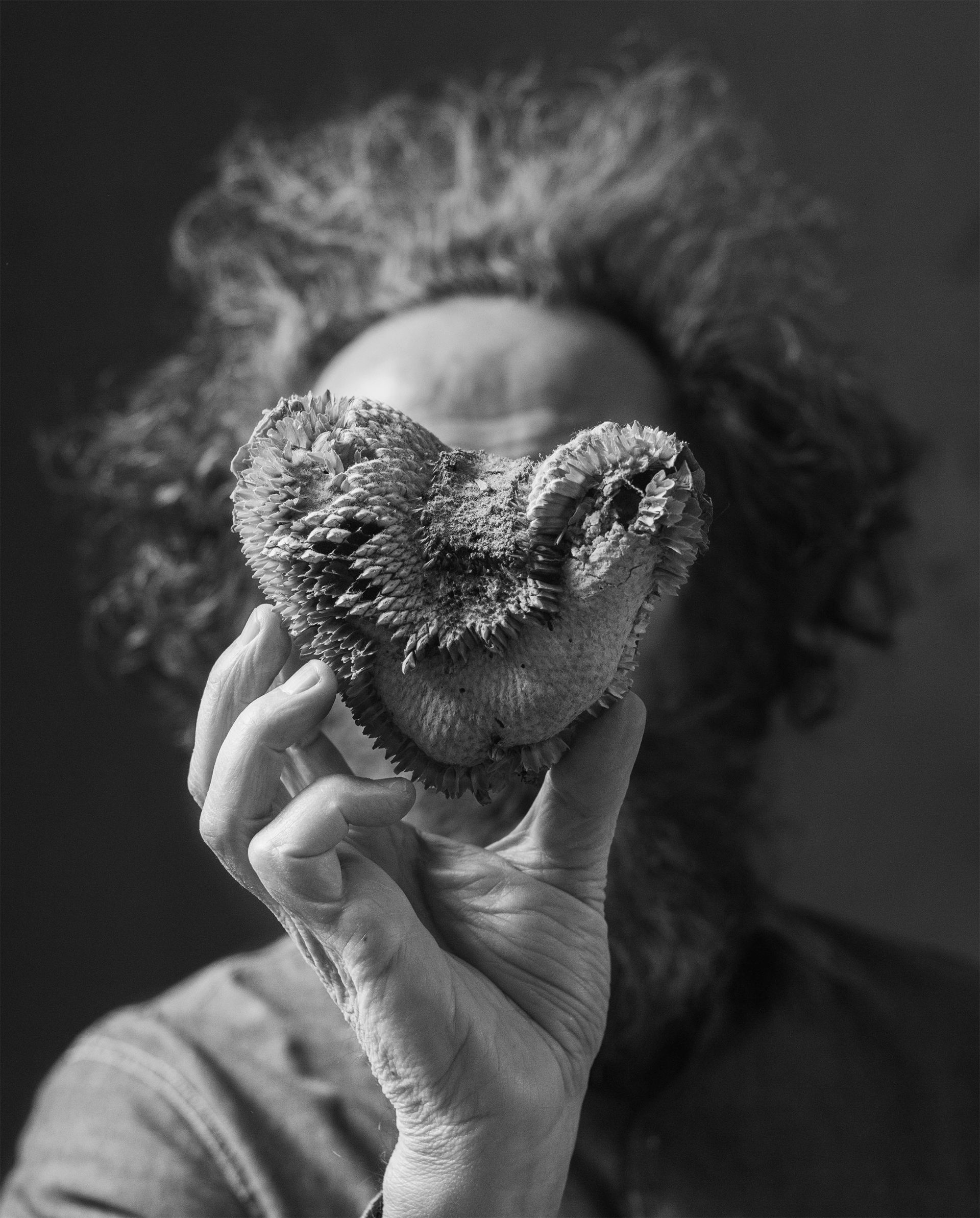 Ogni ciclo di nascita, crescita e morte dura circa nove mesi, spiega, «un tempo simile alla gestazione umana», che qui coincide con l’intera vita del fiore. Pianta il seme, ne segue la crescita, lo protegge dagli agenti atmosferici, dai corvi, dai passeri e, talvolta, anche dai vicini. La piena fioritura arriva dopo i primi mesi, ma a interessarlo è il passaggio successivo, quando il girasole abbandona la sua immagine più prevedibile e prende una forma secca, piegata, quasi corporea.