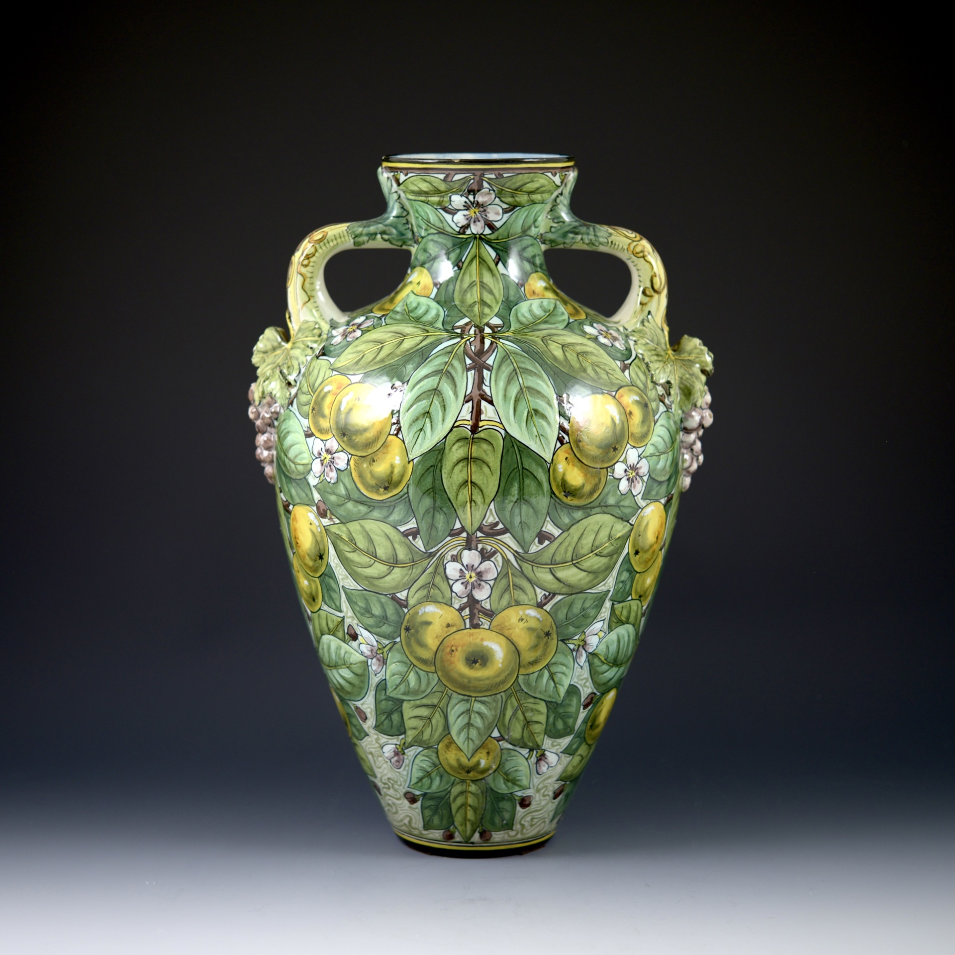 Vaso biansato con grappoli d’uva a rilievo e decoro a pompelmi e zagare Manifattura Cantagalli, Firenze 1895 - 1900 circa. Courtesy of Best Cerami