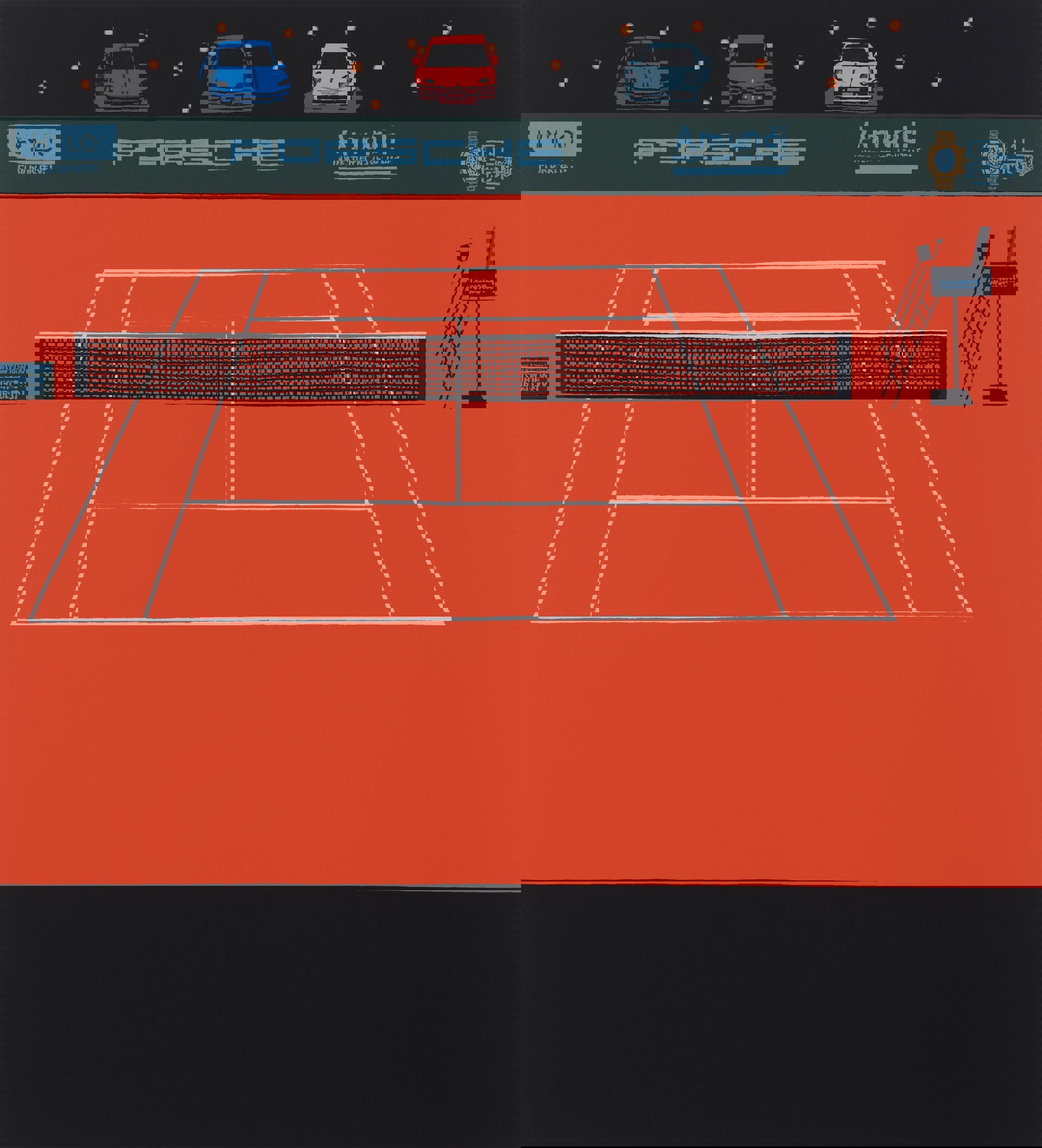 «Ricordo di aver guardato gli Australian Open e di aver scattato foto allo schermo», racconta l’artista. «Il campo appariva come una superficie uniforme, tagliata da linee geometriche. Ho pensato che potesse diventare un dipinto.» Da quelle immagini nasce la serie presentata ora alla Gagosian. Ogni tela prende spunto da tornei diversi del circuito internazionale - dalle competizioni ATP e WTA fino ai Giochi olimpici - ma il punto di vista rimane sempre quello familiare delle riprese televisive, dietro la linea di fondo campo. L’immagine viene compressa in bande cromatiche che trasformano la superficie di gioco in una composizione quasi astratta.