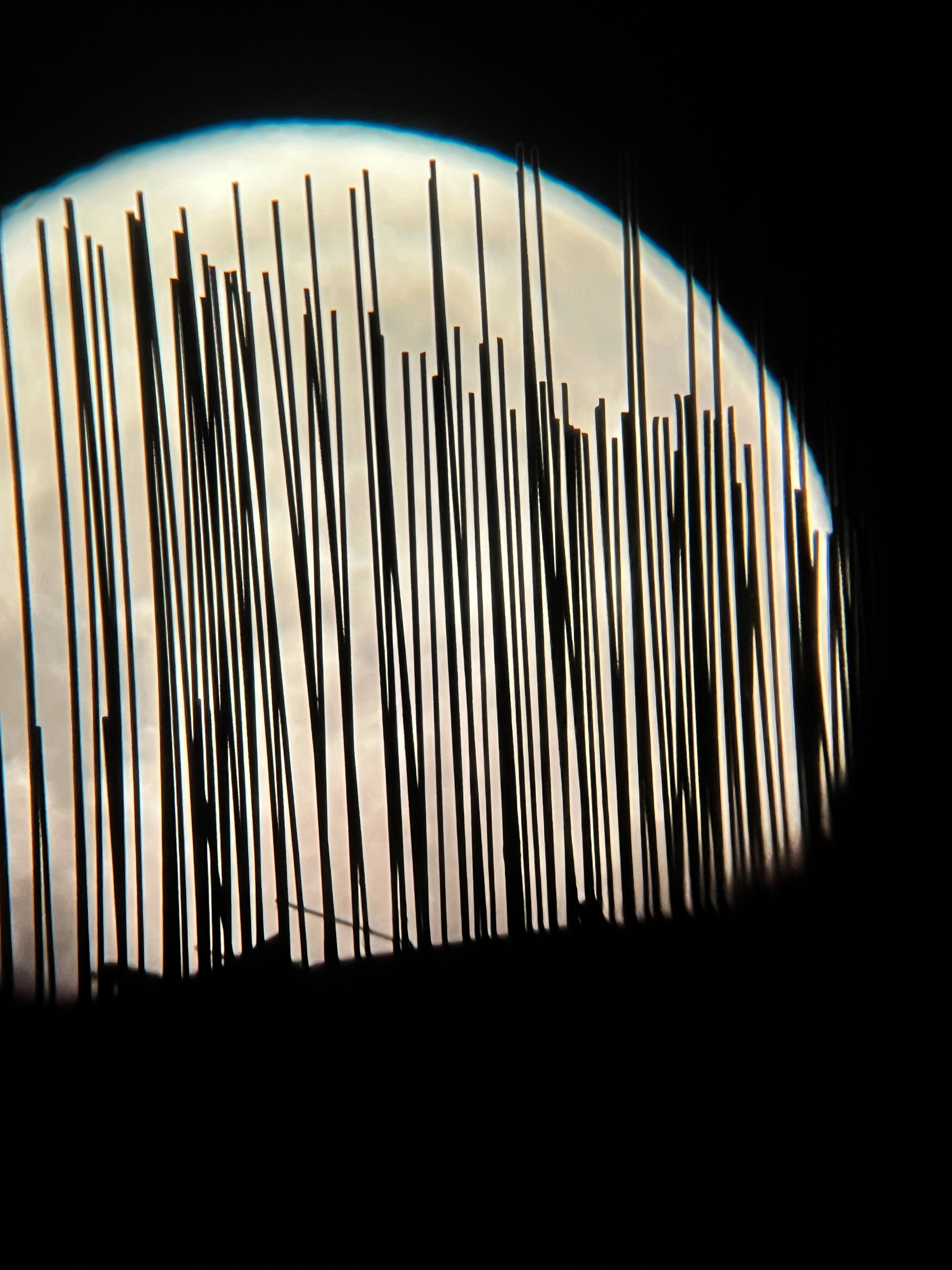 Ho scattato tutte le immagini del volume usando lo smartphone e il telescopio. Questa combinazione, che mi ha permesso di «avvicinarmi» al soggetto e guardare la luna in tutta la sua gloriosa bellezza, ha reso tutto un po’ più difficile dal punto di vista tecnico. La messa a fuoco, l’inquadratura, l’esposizione diventano tutti passaggi più complessi e difficili da gestire. Queste difficoltà, però, hanno facilitato la scoperta di nuovi linguaggi visivi, quali gli sfocati intenzionali, gli aloni di luce ed altre «soluzioni» che si sono inserite perfettamente nella narrativa del libro.