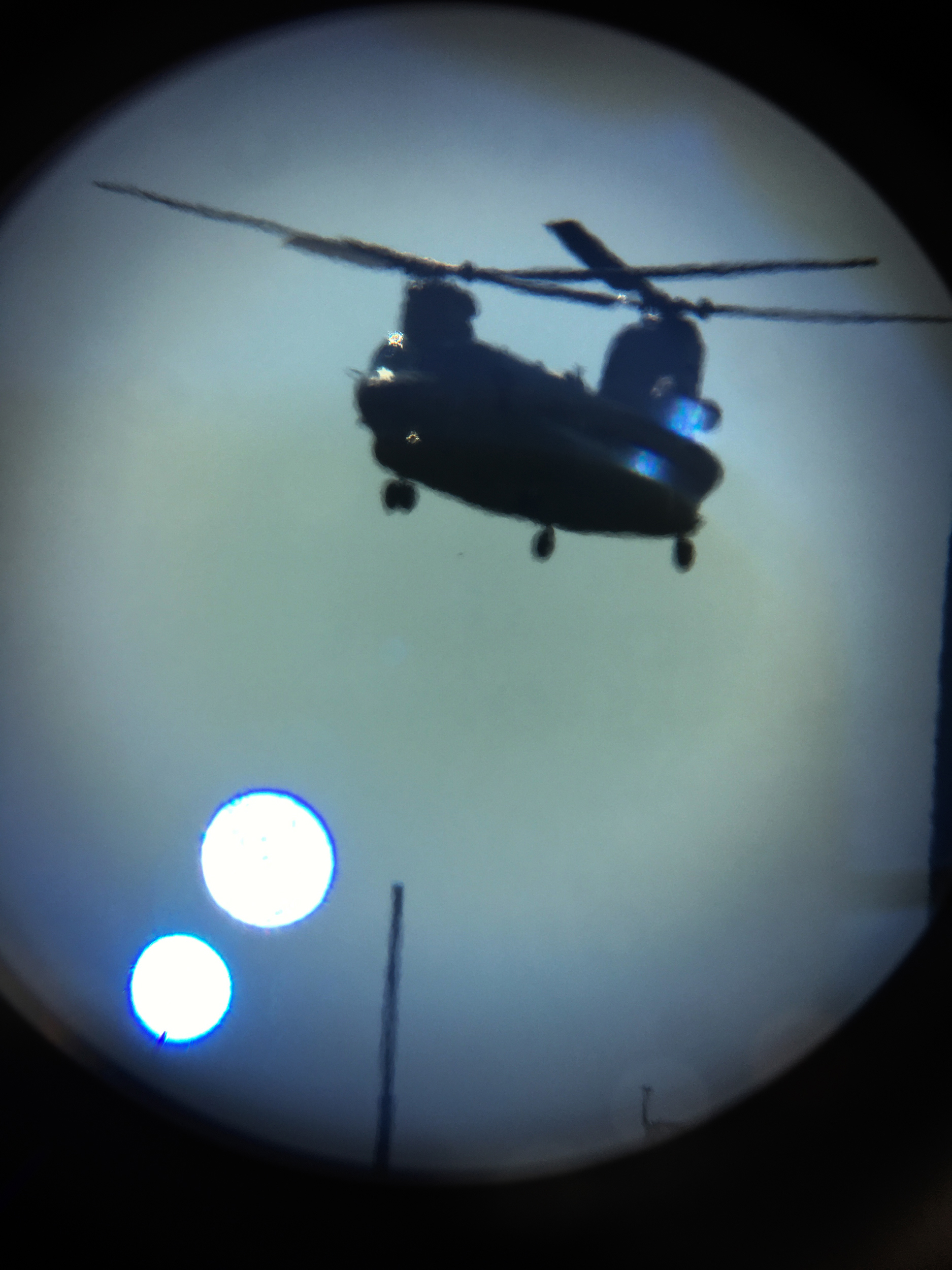 La silhouette del palazzo in costruzione è una tra le fotografie che preferisco di questo progetto. In prima luogo, perché si vedono sia la luna che la città nella stessa inquadratura, e poi perché ritengo che la verticalità delle assi di ferro sostenga la tensione palpabile tra questi due elementi. Questa è una foto scattata di recente, lo scorso aprile. Ricordo che non potevo dormire, come spesso mi accade durante la luna piena. Erano circa le quattro del mattino e la luna si era abbassata fino a quasi scomparire tra i palazzi. Non ho perso tempo e, una volta sistemato il telescopio sul balcone di casa mia, ho seguito pazientemente la traiettoria della luna e scattato questa ed altre foto simili. Scegliere lo scatto è stato difficile, ma più riguardo questa fotografia, più sono convinto di aver fatto la giusta selezione. Il profilo sfocato del ragazzo con gli occhiali che guarda verso l’alto appare sulla copertina di Moon City. Fotografare la gente per strada utilizzando il telescopio e lo smartphone è molto difficile, visto che le persone si muovono rapidamente e il campo di ripresa è molto stretto: i soggetti sfuggono dall’inquadratura e dalla messa a fuoco in un lampo. Anche se ho moltissimi scatti perfettamente nitidi, ho deciso di utilizzare solo le foto delle persone sfocate per creare più distanza e un senso di anonima alienazione. La fotografia dell’elicottero è stata anch’essa molto difficile da catturare, per via della velocità del veicolo rispetto alla lunghezza della focale fissa del telescopio. Questa immagine è molto importante per Moon City, perché offre quel senso d’urgenza che pervade tutto il lavoro. È proprio questa urgenza che rende il progetto rilevante proprio adesso. L’urgenza climatica, le guerre, il ritorno dei nazionalismi e l’enorme divario economico sono solo alcuni degli elementi che spero affiorino nella mente di chi «legge» Moon City più in profondità.