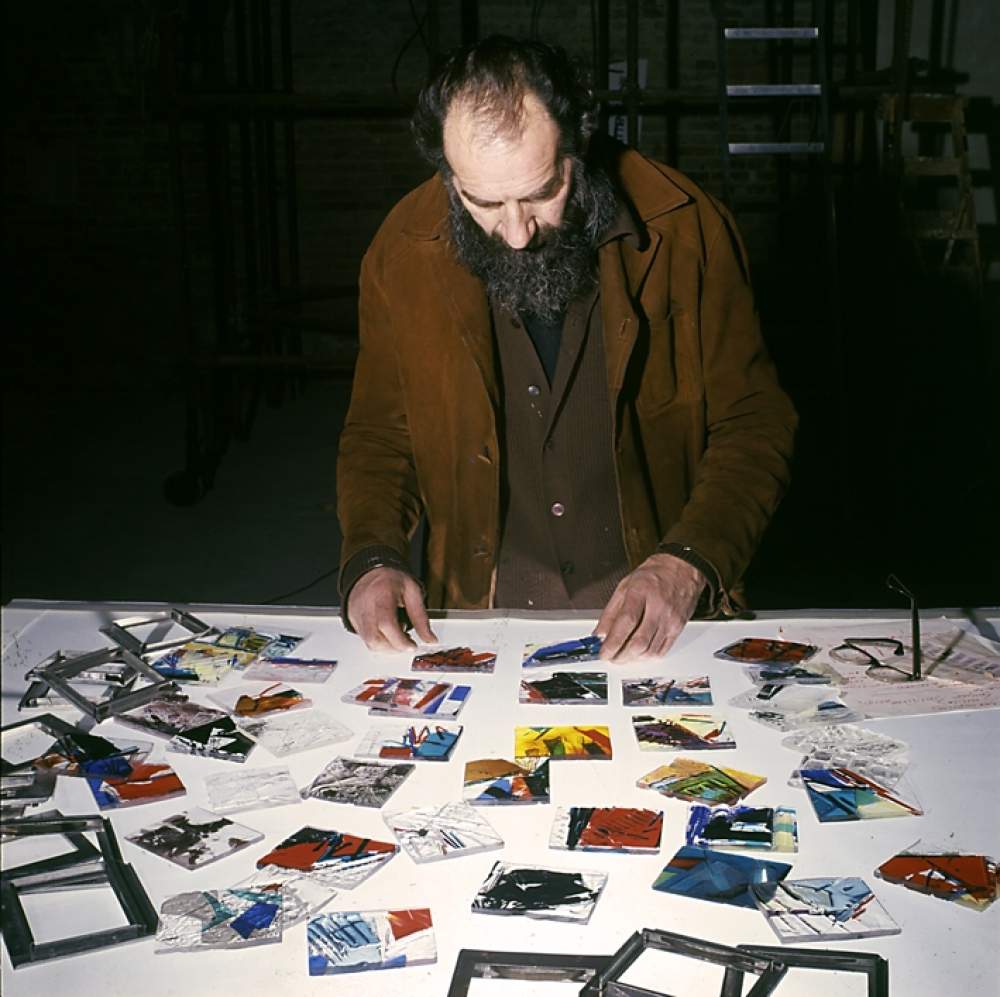 Emilio Vedova sceglie le lastrine nella vetreria Venini di Venezia per la sua installazione a Montreal 1967