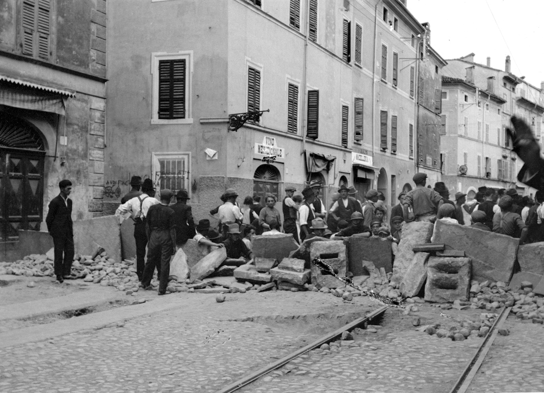 E quando il corpo è urbano? «Se immaginiamo la città come un grande corpo fisico e prendiamo metaforicamente come esempio l’agopuntura, sappiamo che ci sono dei punti lungo i meridiani dove si attiva l’energia. Allo stesso modo mi piace pensare al fatto che, come fotografo, in fondo mi muovo cercando dei punti nello spazio fisico dove collocare il centro di osservazione e da dove poi proiettare lo sguardo». Queste osservazioni di Gabriele Basilico potrebbero essere un buon prologo per la nostra argomentazione. Il fotografo di «Milano. Ritratti di fabbriche», suggerisce una similitudine tra il corpo fisico e quello urbano, individuando in quest’ultimo dei centri nevralgici da cui lo sguardo prende forma. A questo punto, propongo un ulteriore salto spazio-temporale: le barricate di Parma dell’agosto del 1922, uno degli episodi più importanti dell’antifascismo italiano. Uno sciopero generale, indetto dall’Alleanza del lavoro per il primo agosto di quell’anno, fu il pretesto per un’ondata nera, squadracce fasciste cercarono di occupare la città emiliana che, soprattutto nei quartieri popolari, grazie agli Arditi del popolo comandati da Guido Picelli, riuscirono a resistere innalzando barricate per proteggere i propri borghi, le proprie strade, le proprie abitazioni. Purtroppo quella resistenza non riuscì a modificare la Storia: in quello stesso anno, pochi mesi dopo, la marcia su Roma cambiò definitivamente le sorti del Paese. Ma in questa sede cerchiamo di lasciare, anche se è difficile, le vicende storiche ai margini della narrazione e concentriamoci sul risultato iconografico, ossia su quelle 24 immagini che restituiscono le barricate come fossero epifanie urbane, apparizioni temporanee che modificano la fisionomia della città. Fu il giovane fotografo Armando Amoretti, che all’epoca lavorava per lo studio fotografico Vaghi, a scattare quei fotogrammi. Non sappiamo se fu lo stesso Amoretti a chiedere, al titolare dello studio, di poter testimoniare quel passaggio della Storia o se fu Luigi Vaghi a incaricare il giovane apprendista, non potendo lui esporsi in prima persona, essendo già invischiato politicamente (Vaghi nello stesso anno diventerà lo studio ufficiale della Casa Reale). Fatto sta che Armando, socialista e abitante di quei quartieri popolari, si assunse la responsabilità della memoria, scattando 24 fotografie in cui le barricate sono i punti nevralgici da dove proiettare lo sguardo. Lo scontro è assente, non vediamo la battaglia, ma una città in attesa: una dignità armata pronta a un possibile scontro. In alcune fotografie gli abitanti dei borghi sono completamente assenti, rimangono installazioni temporanee, come fossero monumenti spontanei. Le barricate nella loro stabilità effimera.