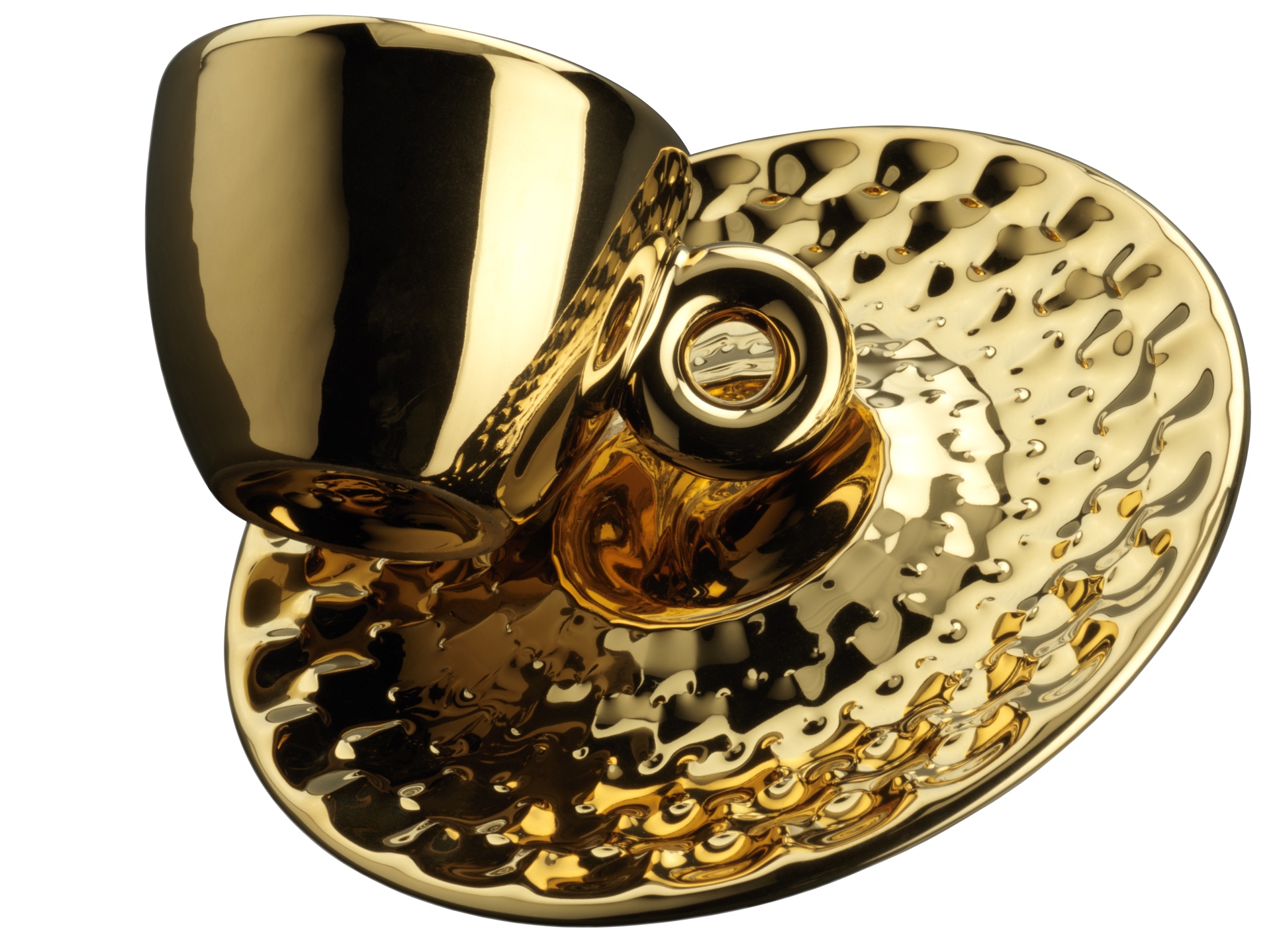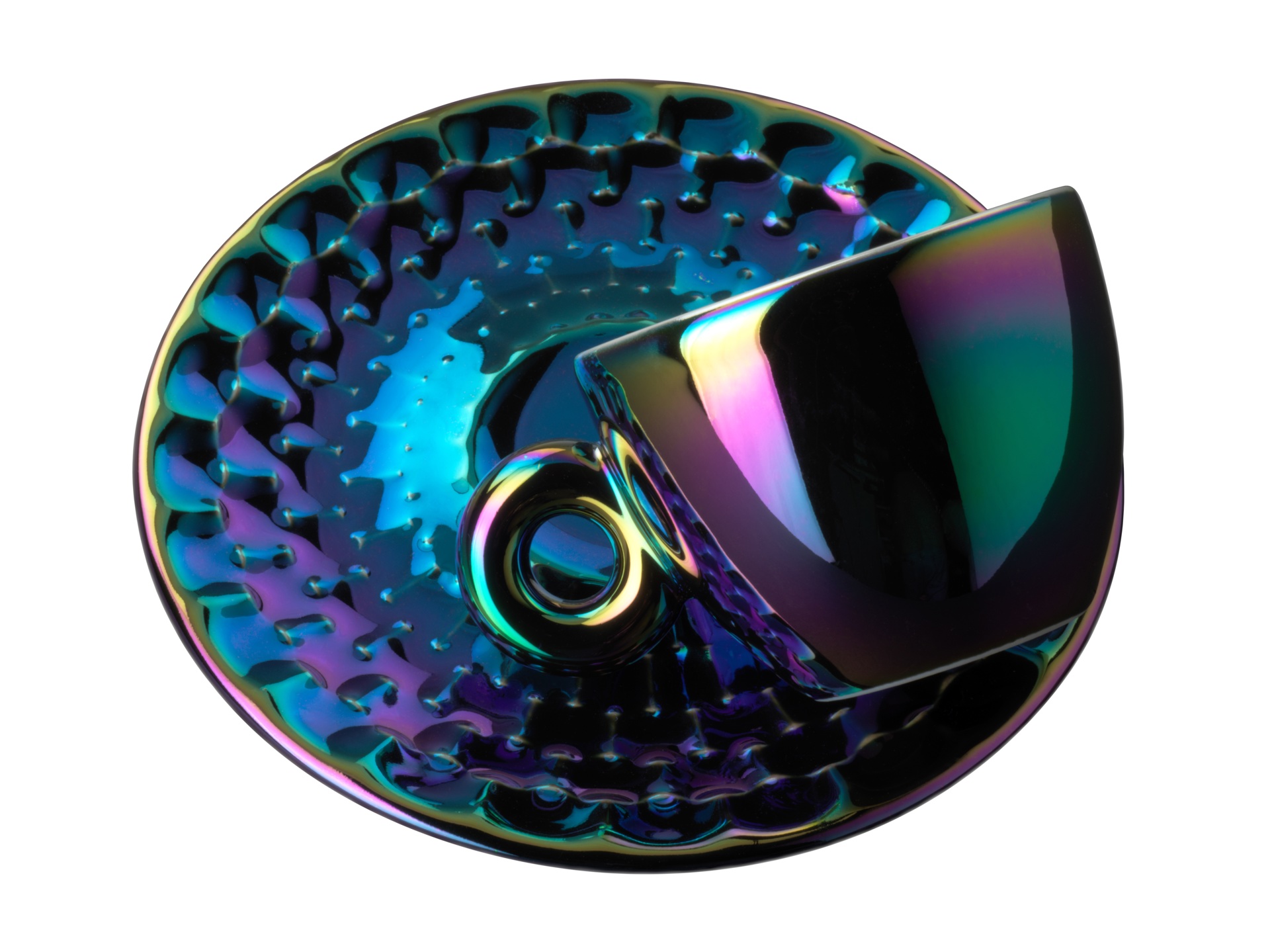 Credo che sia stata più una sfida per le persone che hanno lavorato con me, per trovare una soluzione. Abbiamo parlato di usare colori iridescenti, che utilizzo in molti dei miei quadri, insieme a glitter e altri elementi simili. Abbiamo cercato di capire come trasferire questo sulla porcellana delle tazzine, valutando diverse soluzioni. Doveva anche essere atossico, perché i colori metallici possono essere un problema. Quindi è stata una sfida più per il produttore che per me. L’idea era avere un set di tazze con colori iridescenti diversi, e penso che ci siano riusciti molto bene.