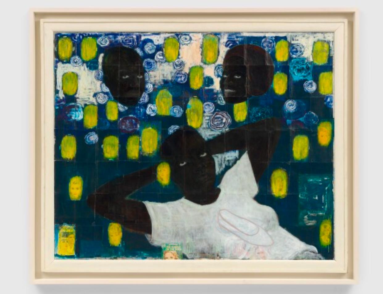 Da David Zwirner, che rappresenta l’artista dal 1994 insieme a Jack Shainman, è in mostra «A Little Romance», dipinto più sobrio risalente al 1990. Al centro della scena, una figura distesa con le mani intrecciate dietro la testa guarda il cielo con espressione sognante. Due teste fluttuanti, prive di corpo, si librano sopra di lui. Potrebbero rappresentare i genitori, oppure presenze immaginarie nate dalla sua mente. Sul fondo blu punteggiato di macchie gialle, simili a lanterne sospese, si intravedono formazioni bianche che ricordano le nuvole. La stesura pittorica, in alcuni punti incerta, introduce una complessità visiva che tende a distrarre lo spettatore più che guidarne lo sguardo.