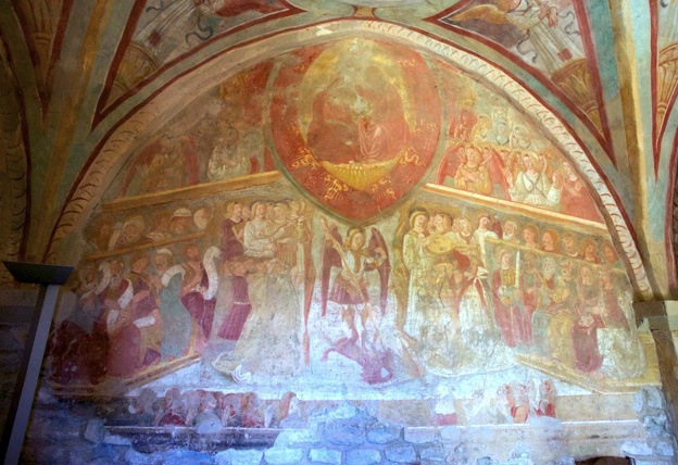 L’origine duecentesca ne attribuisce la fondazione a un ex voto crociato. L’interno, suddiviso in due campate, è coperto da volte a crociera e decorato da affreschi quattrocenteschi (di cui non si conosce con esattezza l’autore), rappresentanti Santa Caterina, la Crocefissione, e un suggestivo Giudizio Universale contrapposto alla raffigurazione dell’Inferno. Gli affreschi dell’oratorio di Santa Caterina sono stati staccati per poterli meglio conservare. Davanti all’altare, di fattura moderna, il piccolo sarcofago di Sant’Acazio del XIII secolo.