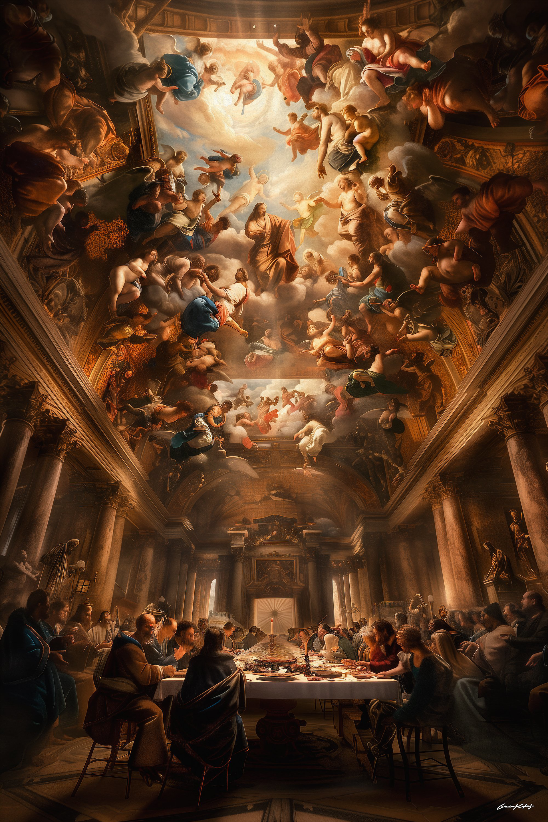 Il seguace di Jacob Jordaens con la monumentale scena di «Filemone e Bauci visitati da Giove e Mercurio» (celebre è il capolavoro di Rembrandt con il medesimo soggetto conservato nella National Gallery of Art di Washington) imposta subito il registro mitologico: l’episodio ovidiano diventa celebrazione della virtù domestica, ma anche esercizio di opulenza narrativa. In controcanto, la «Madonna con Bambino» della cerchia di Gherardo delle Notti assorbe la lezione di Caravaggio trasformando la luce in strumento di rivelazione intima, mentre il «Compianto su Cristo morto» di un seguace di Peter Paul Rubens e la «Lucrezia romana» di ambito reniano insistono su pathos e teatralità. La natura morta secentesca di Jean-Baptiste Monnoyer, con la sua esuberanza floreale, sembra quasi anticipare, in chiave aristocratica, la futura seduzione seriale dei fiori di Murakami: già qui la superficie è spettacolo. Il versante nordico si arricchisce con i due dipinti della Scuola fiamminga, «Noli me tangere» e «De Emmaüsgangers», dove il realismo minuzioso diventa esercizio teologico, e con il paesaggio di Cornelis Gerritsz Decker, allievo del più celebre Ruysdael, che nei suoi sentieri fangosi e nei cieli bassi introduce una dimensione esistenziale della natura. La tensione religiosa si prolunga nella «Vergine in preghiera» della Scuola di Giovanni Battista Salvi e nel «Martirio di Santa Giustina» di ambito veronesiano: la devozione qua si fa costruzione scenica.