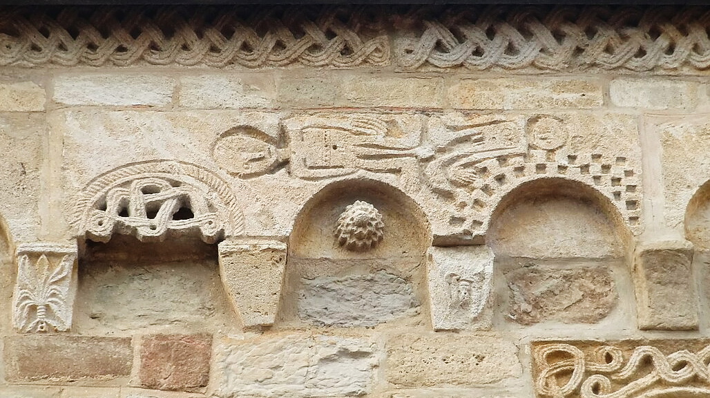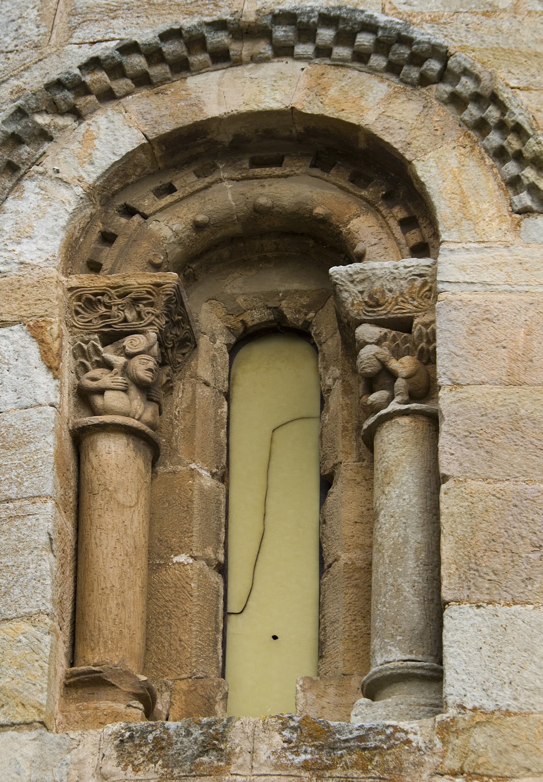 Monofora absidale della chiesa di San Pedro de Cervatos in Cantabria (Spagna), XII secolo. Sui capitelli un uomo e una donna nudi si fronteggiano, esibendo il sesso