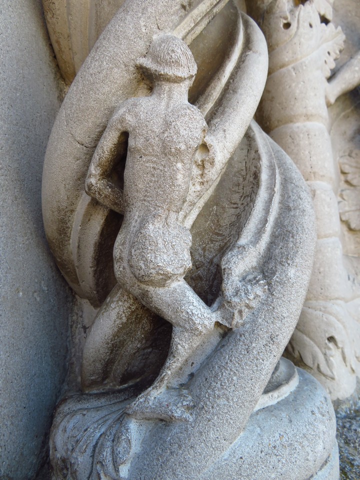 Monaco alla base della colonna esterna di destra del portale di San Fortunato, Todi