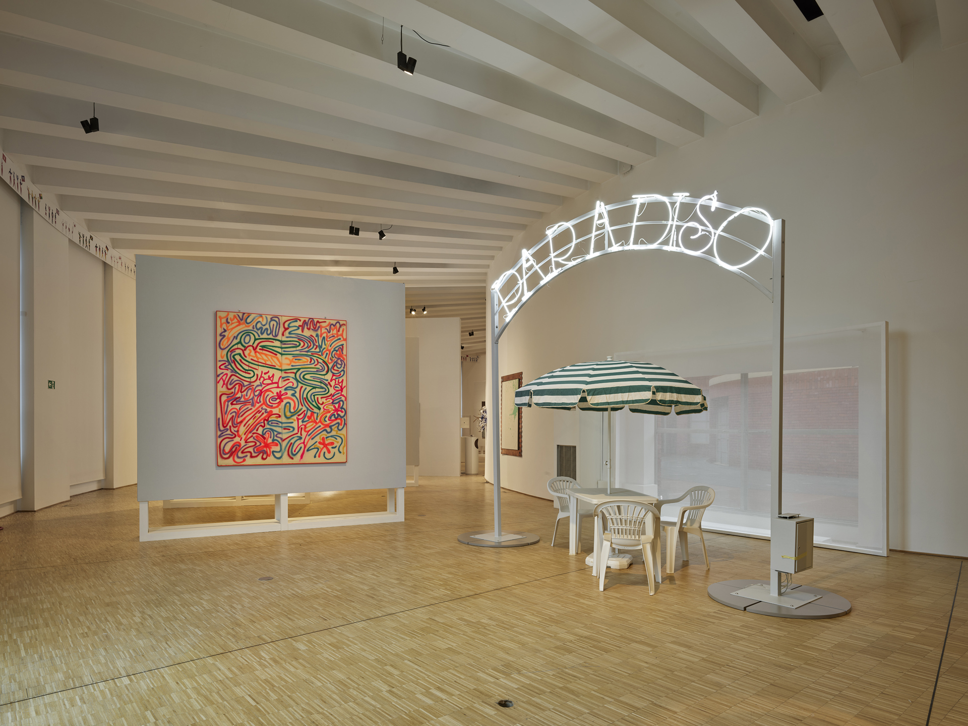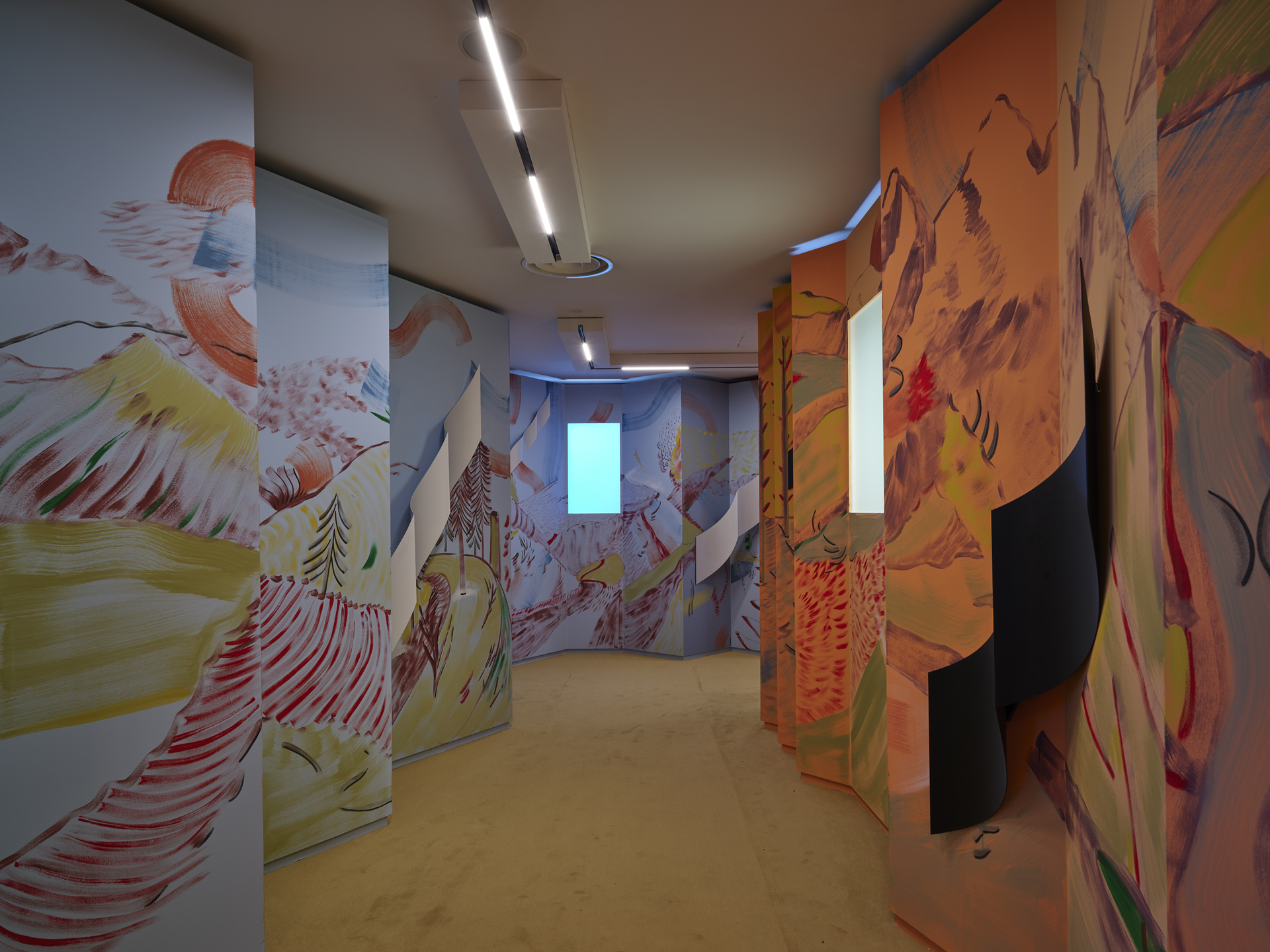 In tutte e tre le sedi l’accesso è segnato da un portale in pannelli di alluminio riflettente, soglia simbolica e architettonica, accompagnata da un intervento di John Giorno concepito come varco poetico e visivo. A Milano e Livigno il wall painting We Gave a Party for the Gods and the Gods All Came (2026) invita a leggere il linguaggio come esperienza visiva, poetica e spirituale; a Cortina l’opera, nella sua versione italiana Abbiamo dato una festa per gli Dei e tutti gli Dei sono venuti, dialoga con la casa come spazio di pluralità e condivisione. Il progetto architettonico interpreta MUSA a partire dal paesaggio montano, elemento fondante naturale e simbolico: l’allestimento costruisce un fil rouge comune fra le tre sedi secondo principi di leggerezza, temporaneità e rispetto del contesto, con riferimenti alle infrastrutture sportive e all’architettura di montagna — dai bivacchi ai sistemi di risalita — attraverso forme modulari e seriali che evocano movimento e spirito tecnico. Il binomio materico tra alluminio e legno sintetizza la visione: all’esterno l’alluminio riflettente richiama i rifugi d’alta quota e smaterializza l’architettura nel paesaggio; all’interno il legno restituisce una dimensione calda e accogliente, riaffermando ospitalità e senso di casa.