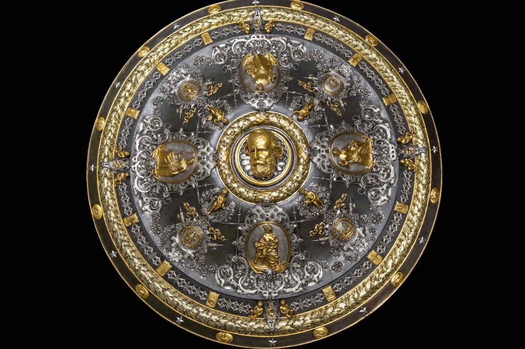 L’opera, oggetto di una mostra al ViVe-Vittoriano e Palazzo Venezia, è ispirata al clipeo, il grande scudo dell’antichità in metallo, rotondo e bombato, utilizzato dai soldati greci e romani