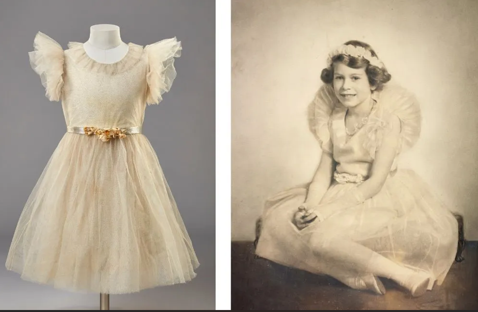 A sinistra: abito da damigella d'onore, Edward Molyneux. A destra: la regina Elisabetta II quando era la principessa Elisabetta di York, Elliott & Fry, 1934. Fotografo dell'abito da damigella: Jon Stokes.