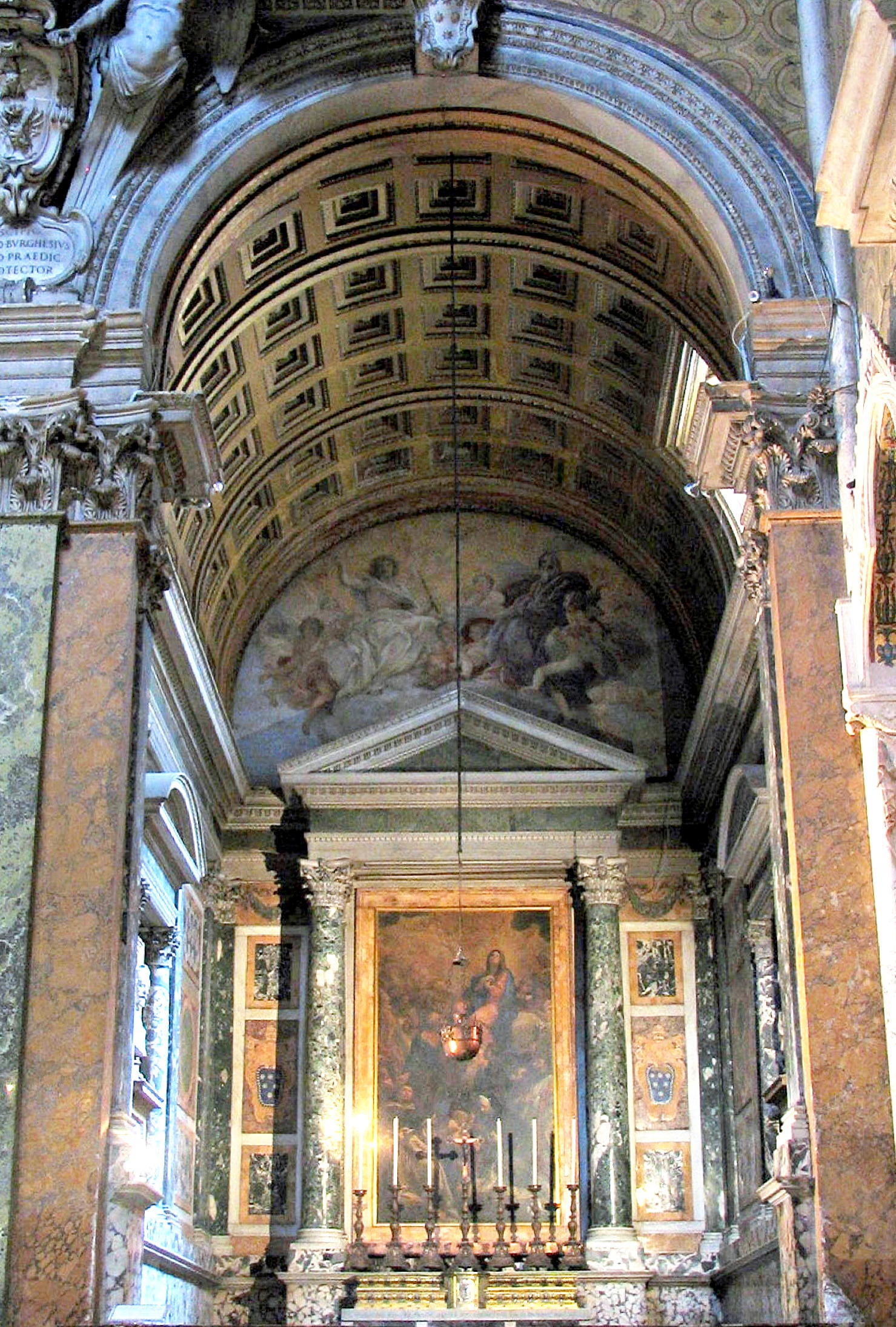 Leggi i suoi articoliLa Vergine è seduta in cielo fra le nubi, ai suoi piedi san Pietro con cinque santi, ciascuno ritratto in pio atteggiamento di devozione. Sono Gaetano da Thiene, Francesco Borgia, Filippo Benizzi, Rosa da Lima e Luigi Bertrand, canonizzati da Clemente X Altieri nell’aprile del 1671 nella Basilica di San Pietro.