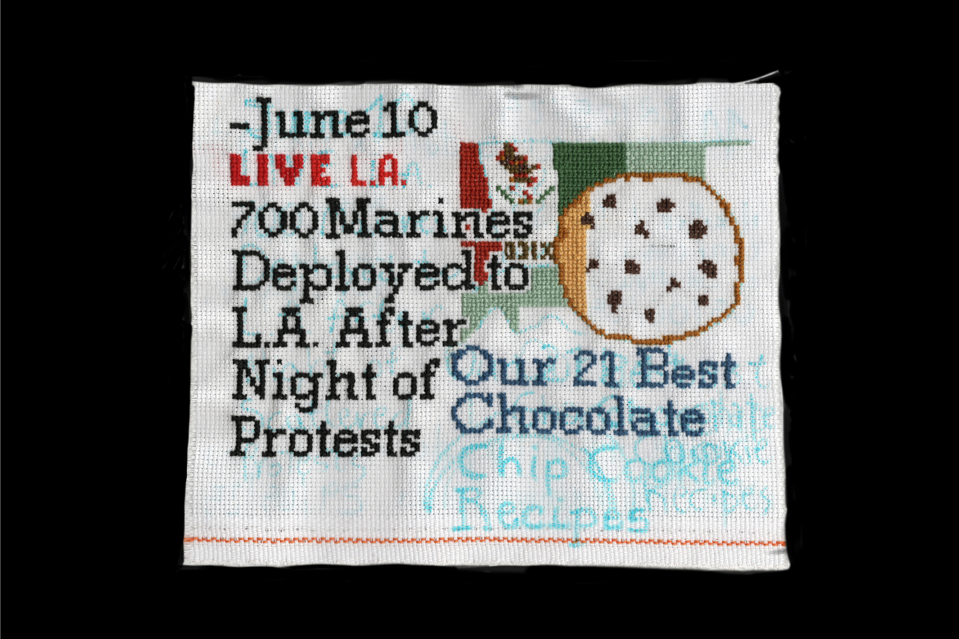 Per invitare a un’esperienza di lettura più lenta delle notizie, l’artista Viola Silvi ha riprodotto le prime pagine di un giornale a punto croce: un’attività che «si sforza di interrompere il flusso senza fine di immagini» e storie, incoraggiando maggior introspezione. Qualcosa di simile accade nei poster realizzati dalla Chopped Liver Press di Adam Broomberg e Oliver Chanarin, dove la ripetizione di citazioni più o meno ironiche, stampate in caratteri cubitali in tinte rosso fuoco e impresse su 100 pagine dell’edizione internazionale del «New York Times», ristabiliscono le dinamiche di forza tra «news effimere», rimpiazzate ogni giorno, e i messaggi di critica lasciati su di esse dai due artisti. Altrove, «Immagini di repertorio» di Sophia Rabbiosi denuncia l’utilizzo della medesima stock image in 21 notizie rilasciate da outlet differenti, evidenziandone la strumentalizzazione, mentre Letizia Nicolini e il suo «Unmarked» catturano il legame tra potere e l’IA attraverso un carosello di immagini che, pubblicate sui social di Donald Trump, non sono tuttavia state dichiarate come artificiali.