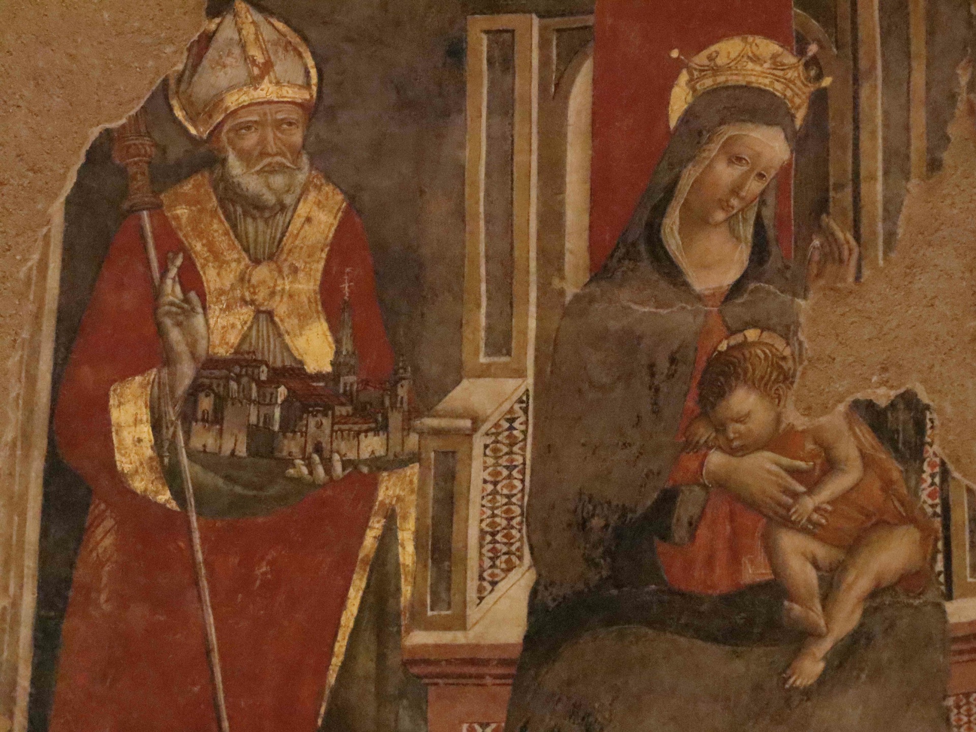 Degli affreschi quello subito a sinistra dell’ingresso prima era coperto per una buona metà e tanti non lo notavano: ora si vede integralmente. Gli altri sono apparsi durante i lavori. Sempre sulla parete sinistra, risalta nella nicchia ad arco acuto la Madonna in trono con Bambino e angeli con datazione del 1478 e, in posizione leggermente avanzata sulla destra, una bella figurina femminile, resto di un affresco di primo ‘500 posto sopra al precedente senza toccarlo. Spicca, nel transetto sinistro, il grande affresco di fine ‘400 - inizi ‘500 dai pigmenti come l’azzurrite o l’ocra rossa: a sinistra san Benedetto ha la città di Norcia in una mano e a destra compare san Gregorio; al centro, il volto della Madonna con Bambino sembra di un pittore di qualità più raffinata: chissà. Sempre nel transetto sinistro, una piccola icona della Madonna sopra l’altare galleggia in uno spazio vuoto per ricordare il dipinto di Filippo Napoletano nel 1621 ridotto in pochi brandelli.
