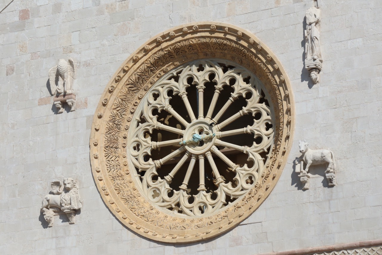 Il rosone della facciata della basilica di San Benedetto a Norcia a fine agosto 2025. Foto: Stefano Miliani
