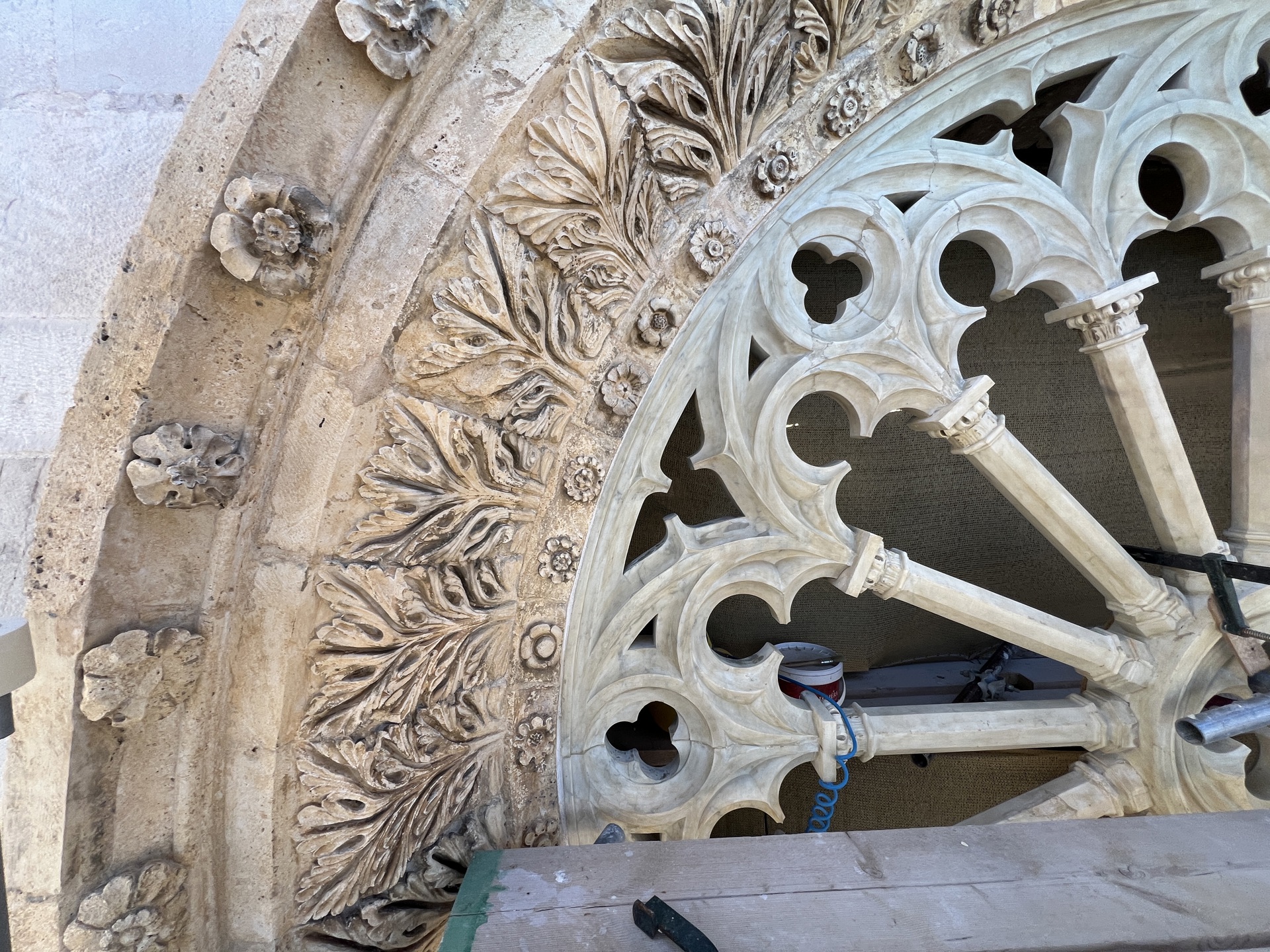 La basilica di San Benedetto a Norcia prossima a fine lavori, il rosone della facciata. Foto: architetto ingegnere Luigi Trincia, ispettore di cantiere