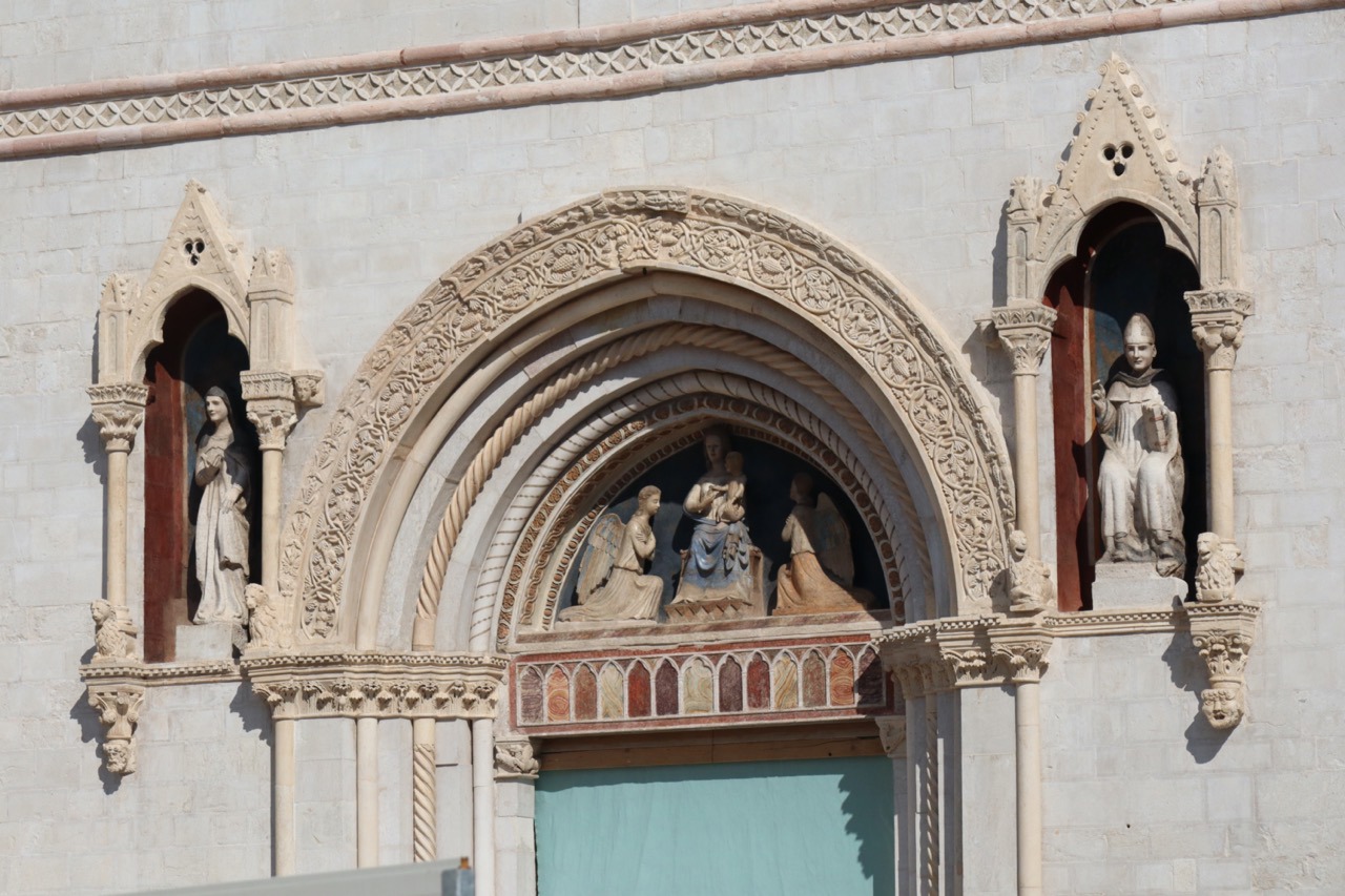 Il portale con le edicole della facciata della basilica di San Benedetto a Norcia a fine agosto 2025. Foto: Stefano Miliani