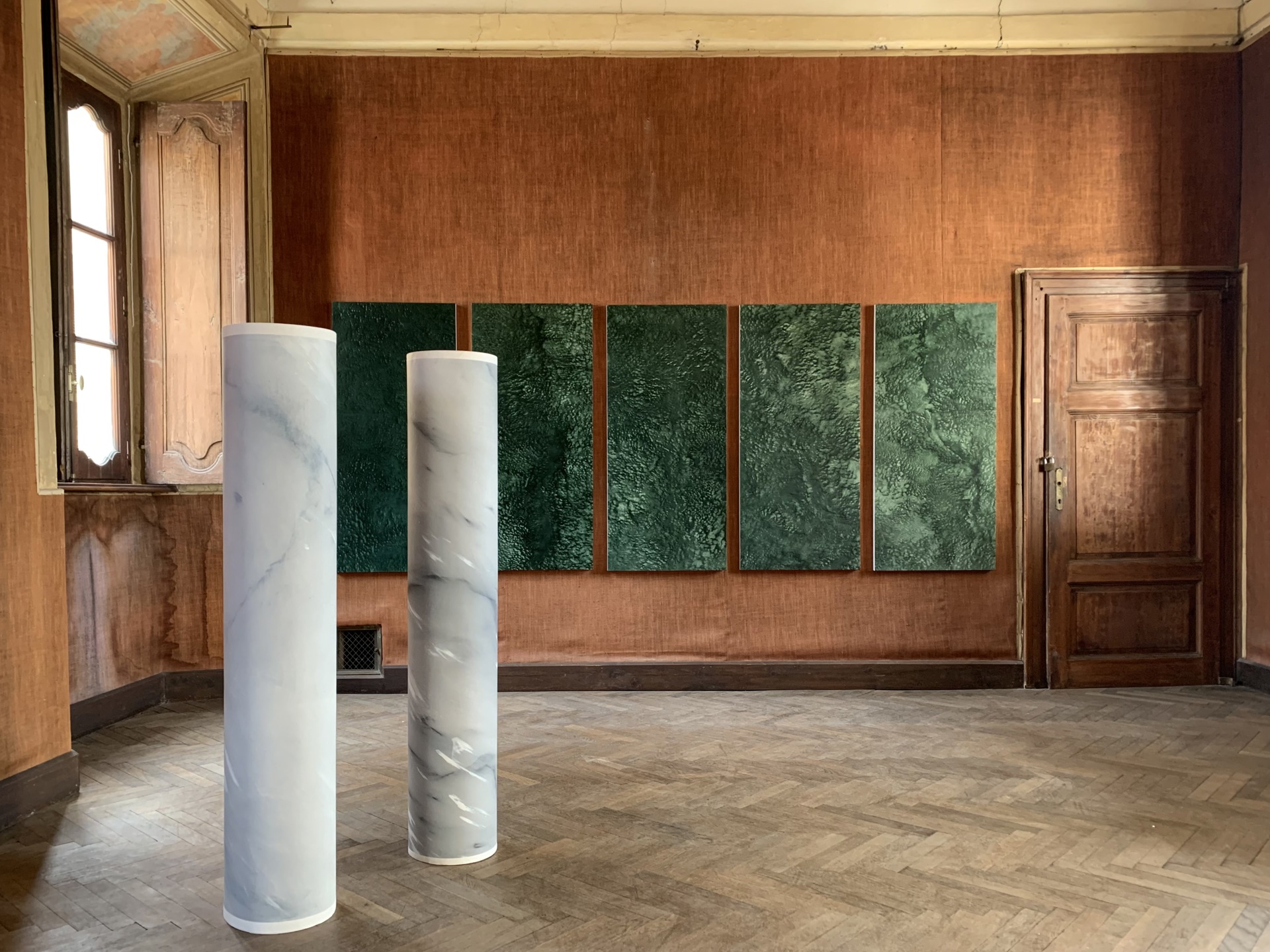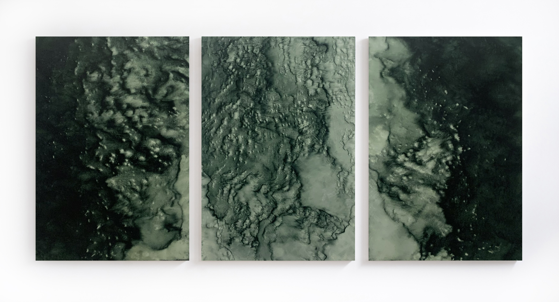 Al centro dell’esposizione si colloca il trittico ad acrilico su tela «Passeggiata (verso sud)», esito di una tecnica che rievoca il frottage, pur discostandosene radicalmente. L’artista ha ricalcato porzioni della riva dell’Adda su una tela sottile, utilizzando pennelli a setole morbide e lasciando che il colore registrasse superfici, dislivelli, presenze. A differenza del frottage tradizionale, qui le parti più esposte emergono leggere, quasi aeree, mentre le zone in profondità si addensano in tonalità scure e ombrose. Le cromie nascono sul momento, in dialogo diretto con le condizioni atmosferiche e ambientali: una pratica che accoglie l’imprevisto e riconosce al paesaggio un ruolo attivo nella costruzione dell’opera.