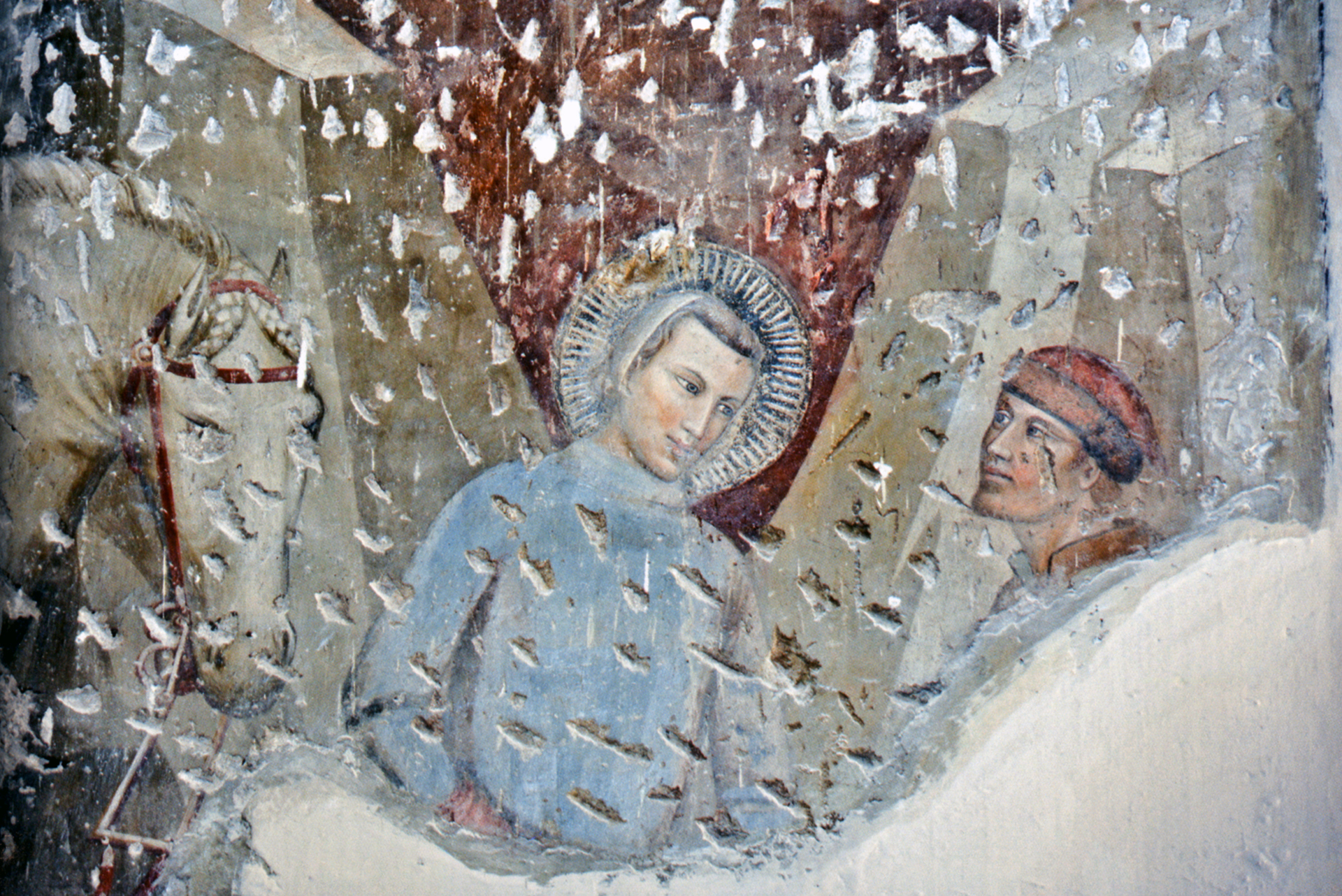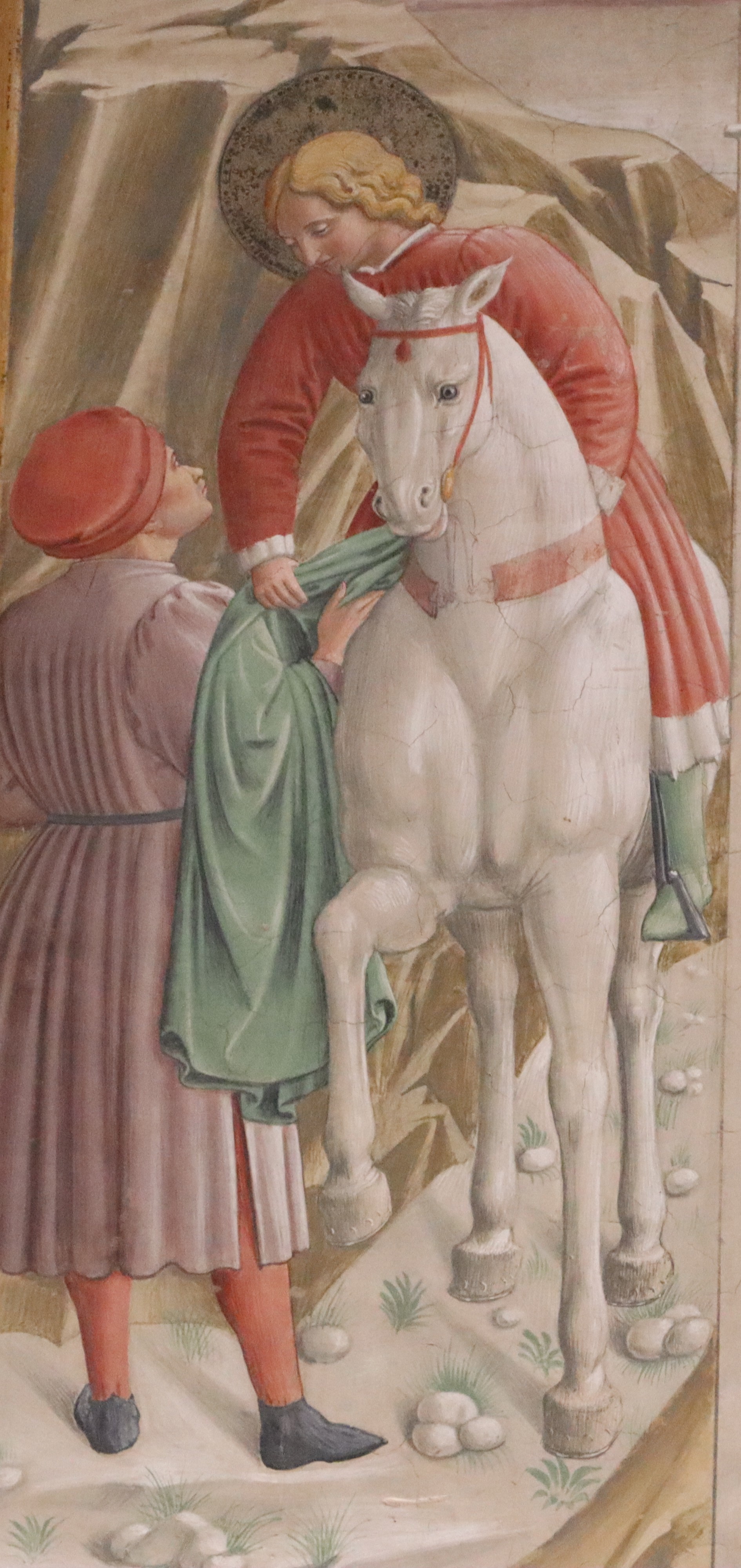 Il giovane Francesco, elegante come si conveniva al figlio di un ricco mercante, incontrò un giorno «un cavaliere, nobile ma povero e mal vestito». Subito, continua Bonaventura da Bagnoregio nella Leggenda maggiore (1263), «si spogliò e gli fece indossare i suoi vestiti». Nell’illustrazione di Giotto entro il ciclo (1290-92) della Basilica superiore di Assisi, il santo leva la sopravveste azzurra (che, rivoltata, mostra la fodera gialla) e sfila la mano ancora impigliata nella manica, particolari che da soli misurano la naturalezza di un’arte nuova. Il cavaliere, di recente divenuto povero, esibisce abiti da ricco: una bella veste rossa e un cappello foderato di vaio. Altrettanto dignitoso appare nella versione trecentesca in San Francesco a Matelica (Macerata), attribuita ad Allegretto Nuzi e purtroppo compromessa da un’ampia lacuna, oppure in quella di Benozzo Gozzoli (1450-52) in San Francesco a Montefalco, dove Francesco emula san Martino e, senza scendere da cavallo, dona al povero non la veste ma il mantello.