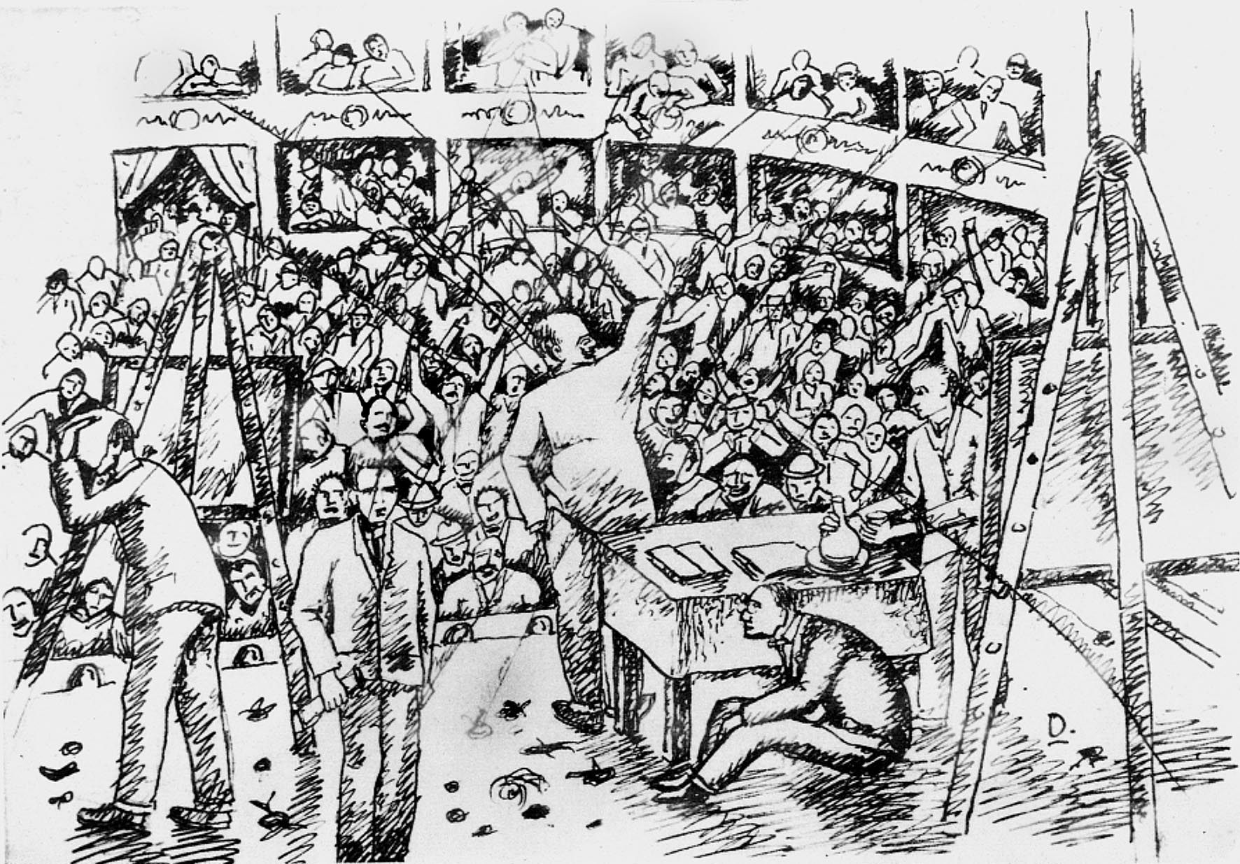 Disegno di Gerardo Dottori della serata futurista del 1914 al Teatro Turreno di Perugia, collocazione ignota. Courtesy Archivi Dottori