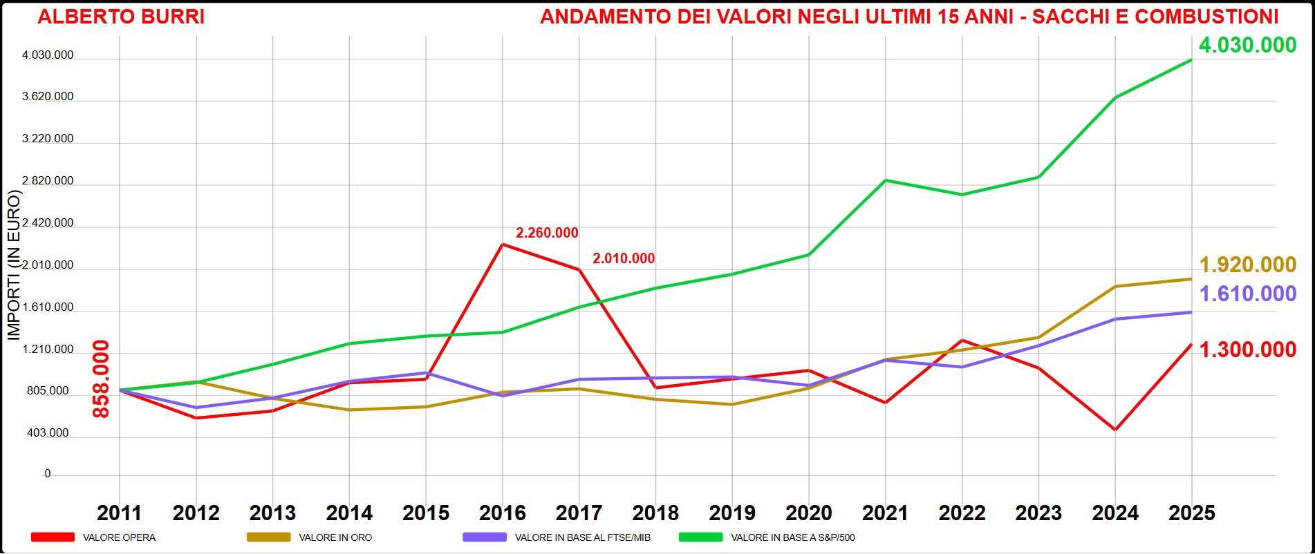 Negli ultimi dieci anni il mercato di Alberto Burri (1915-95) è sceso del 42% rendendo indimenticabile il biennio 2016-17 quando la grande mostra al Guggenheim di New York «The Trauma of Painting» lo aveva lanciato in orbita. Il record, infatti, rimane incollato a quel 10 febbraio 2016 quando da Sotheby’s a Londra «Sacco e Rosso» del 1959, sacco con interventi pittorici di 149,9x129,5 cm, si è imposto per 9,1 milioni di sterline. Da allora (fatto salvo per l’ottimo 2017) è iniziato il vero trauma per i collezionisti che si sono trovati di fronte a un’erosione dei prezzi tanto che il 28 giugno 2023 da Christie’s a Londra «Sacco SP1» del 1956, sacco su fondo nero (102x75 cm) piuttosto angosciante ma non certo trascurabile, è scivolato a 2,9 milioni di sterline rimanendo al di sotto delle stime minime. Anche le «Combustioni» non brillano e «Rosso Plastica» del 1963 (80x100 cm) è passata dai 3,6 milioni di sterline ottenuti il 12 febbraio 2014 da Sotheby’s a Londra, ai 3,3 milioni fatti registrare il 10 luglio 2020 da Christie’s a Londra. Ma c’è da consolarsi con il fatto che dal 2011 ad oggi gli incrementi sono stati del 51%. Se non ci fossero stati quei due anni d’incredibili follie il mercato avrebbe avuto un andamento costante.