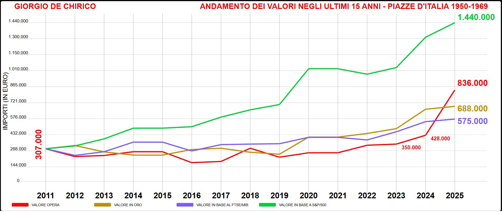 Insieme al Surrealismo, si è impennato anche Giorgio de Chirico (1888-1978) che nell’ultimo triennio è cresciuto del 139%, almeno per le «Piazze d’Italia» più commerciali degli anni Cinquanta e Sessanta, superando addirittura l’oro. Un andamento in netta controtendenza rispetto al mercato italiano che dimostra un trend inimmaginabile sino al 2023 quando le quotazioni erano pressoché simili a quelle del 2011 con un incremento complessivo di appena il 14%. Per rendersi conto del trend, è sufficiente osservare quanto è avvenuto per «Piazza d’Italia» del 1953 di 40x50 cm che nel 2013 costava 170mila euro, una cifra che rimane invariata nel 2019. Ma alla fine del 2022 saliva a 350mila euro per poi proseguire la sua corsa nel 2025 quando, il 27 maggio, è stata venduta da Il Ponte a Milano per 448mila euro, ben al di sopra delle stime posizionate prudentemente a 150-250mila euro. Che il mercato del pictor optimus sia particolarmente brillante, lo ha confermato anche Dorotheum a Vienna che il 20 maggio 2025 ha venduto per 520mila euro «Piazza d’Italia» del 1954 (50x71 cm) proposta in catalogo a 250-350mila euro. Dopo un lungo letargo de Chirico festeggia, ma è evidente che la smania degli speculatori vada tenuta sotto controllo.