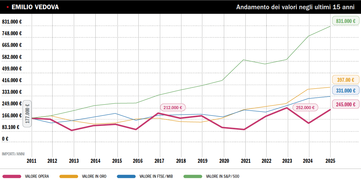Sebbene l’impeto gestuale della sua pittura consenta un legittimo confronto con l’Action Painting americana, i prezzi di Emilio Vedova (1919-2006) sono infinitamente più bassi, con listini che non si discostano molto da quelli del decennio scorso. In 25 anni l’incremento è stato piuttosto modesto, pari al 38% con top price che reggono da lungo tempo. Il record, infatti, lo ha raggiunto «Tensione n.4» del 1959 (145,5x196 cm) che il 31 maggio 2017 da Dorotheum a Vienna si è imposto per 792mila euro. Ma in seconda posizione si trova «Ciclo 61/62 n.2» del 1961-62, un dipinto a olio e collage di 146x200 cm venduto per 776 mila euro il 26 maggio 2008 da Christie’s a Milano. E nonostante siano passati 17 anni da allora, se l’opera venisse proposta oggi non potrebbe ambire a una cifra maggiore. I valori, dunque, non hanno subito particolari scossoni in un contesto che apprezza in particolare i lavori della fine degli anni Cinquanta. E quando il 26 novembre 2025 Sotheby’s a Milano ha proposto «Spagna n.4» del 1959 (119x120 cm), che appartiene a uno dei suoi cicli più celebri, l’aggiudicazione finale è stata di 571mila euro, di gran lunga il prezzo più alto degli ultimi 12 mesi. Ma le opportunità sono ancora molte e si possono acquistare al di sotto dei 40mila euro piccoli lavori storici degli anni Sessanta.
